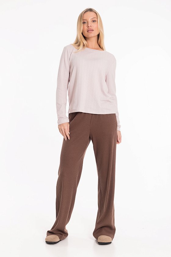 Женский лонгслив из кулирки фламли в вертикальную полоску. Модель свободного силуэта с втачным рукавом и круглой горловиной, оформленной планкой. Универсальный вариант для комфортных повседневных образов.