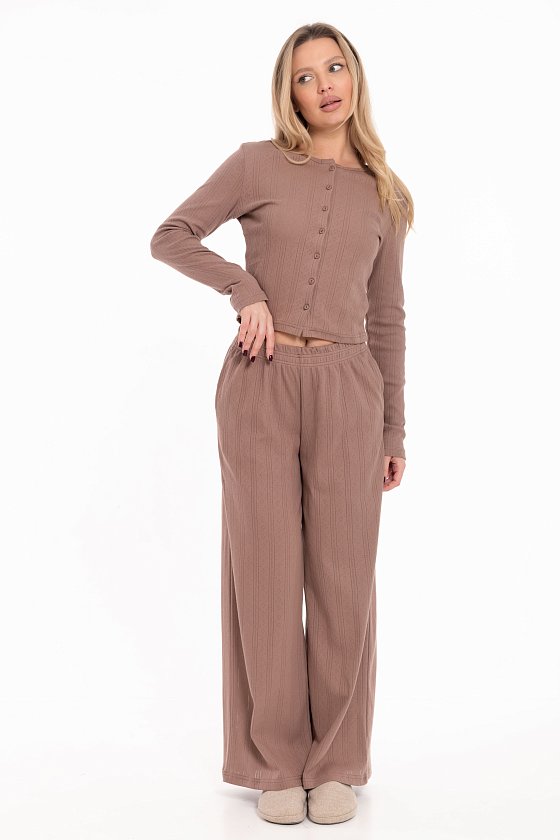 Лонгслив выполнен из трансферной рибаны, которая обеспечивает комфортную посадку и мягкость при носке. Модель полуприлегающего кроя с круглым вырезом горловины и длинным втачным рукавом создаёт лаконичный силуэт. Удобная застежка на пуговицы по всей длине спереди делает эту модель практичной и функциональной. Этот лонгслив станет отличной базой для уютного домашнего образа или расслабленного отдыха.