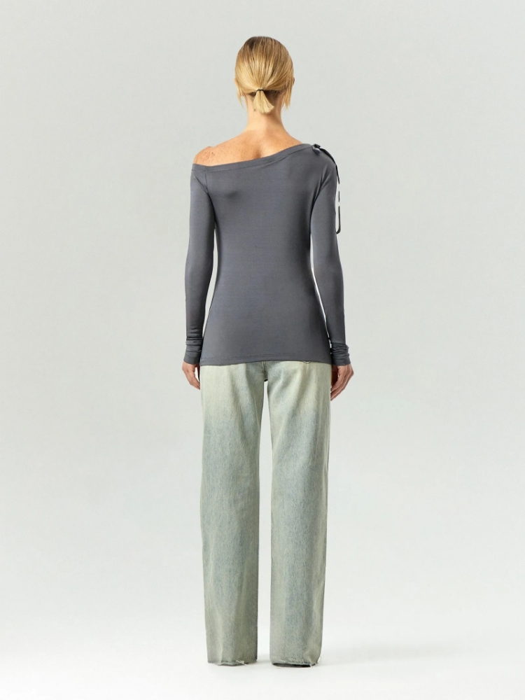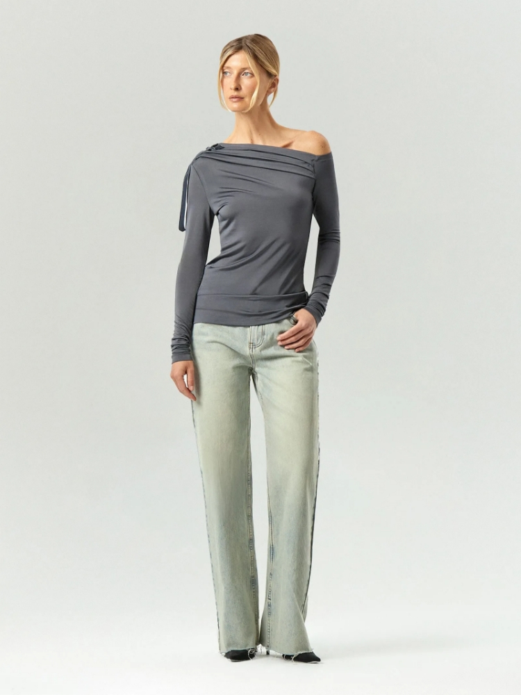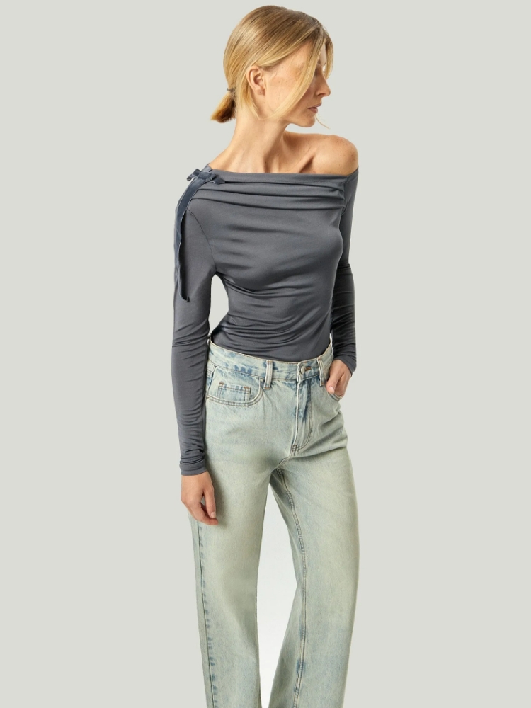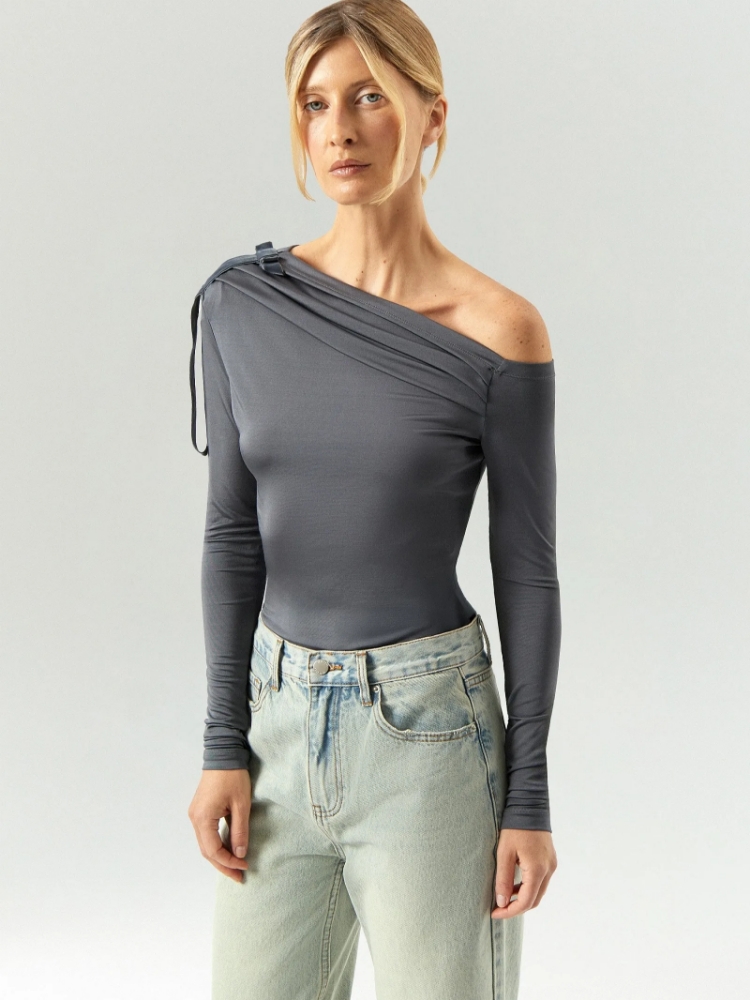 Элегантный и женственный лонгслив в актуальном цвете графита незаменим в гардеробе. Он разнообразит повседневные выходы, станет основой коктейльных образов или аутфитов для стильных выходных и вечеров пятниц. Асимметричная модель на одно плечо украшена драпировкой и бархатным бантом. Эта деталь выводит образ на новый уровень, делая его изысканным. Лонгслив сделан из ацетата с добавлением эластана: ацетат даёт шелковистость и лёгкий сатиновый блеск трикотажу, а эластан улучшает посадку, помогает держать форму после стирок и носок.Завершить образ можно юбкой в бельевом стиле для коктейльных образов или базовыми джинсами для планов на вечер после работы