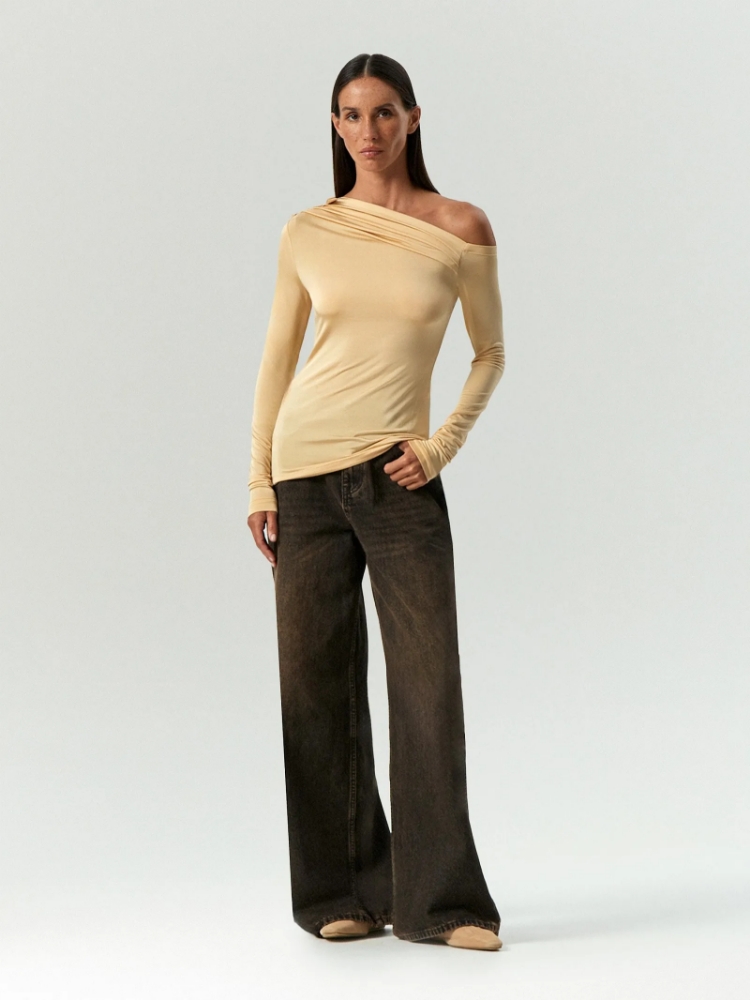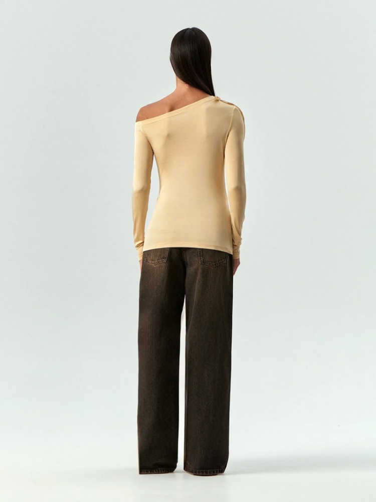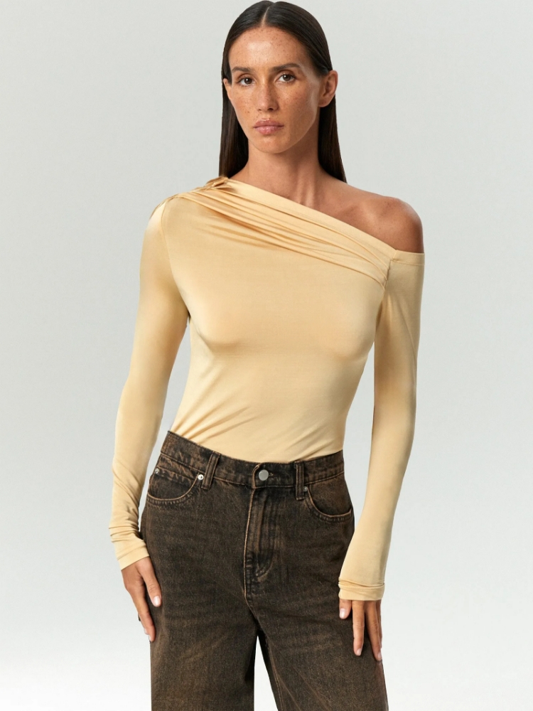 Элегантный и женственный лонгслив в актуальном цвете сливочного масла незаменим в гардеробе. Он разнообразит повседневные выходы, станет основой коктейльных образов или аутфитов для стильных выходных и вечеров пятниц. Асимметричная модель на одно плечо украшена драпировкой и бархатным бантом. Эта деталь выводит образ на новый уровень, делая его изысканным. Лонгслив сделан из ацетата с добавлением эластана: ацетат даёт шелковистость и лёгкий сатиновый блеск трикотажу, а эластан улучшает посадку, помогает держать форму после стирок и носок.Завершить образ можно юбкой в бельевом стиле для коктейльных образов или базовыми джинсами для планов на вечер после работы