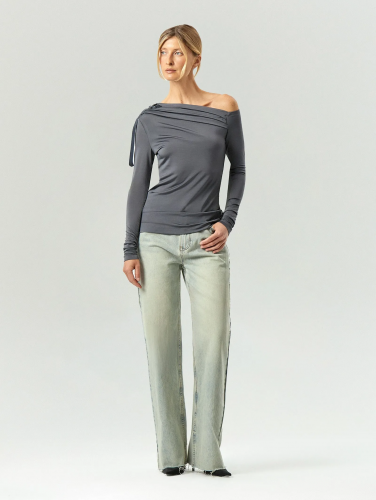 Асимметричная модель на одно плечо украшена драпировкой и бархатным бантом. Эта деталь выводит образ на новый уровень, делая его изысканным.
