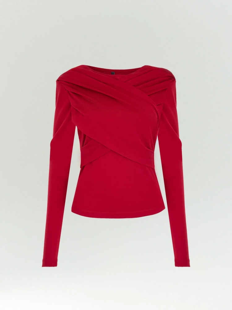 Роскошный полуприлегающий лонгслив с драпировкой и подплечниками. Драпировка не только делает образ эффектнее, но и даёт ещё более красивую посадку. Подплечники создают форму, структурируют верхнюю часть силуэта: такой трикотаж смотрится дорого. Качественный материал из вискозы приятен к телу. Сочный красный цвет добавляет в гардероб яркости. Лонгслив станет удачным решением как для повседневных, так и для коктейльных или вечерних образов. Идеально сочетается со стильными брюками модных фасонов и простым денимом. Модель маломерит на один размер