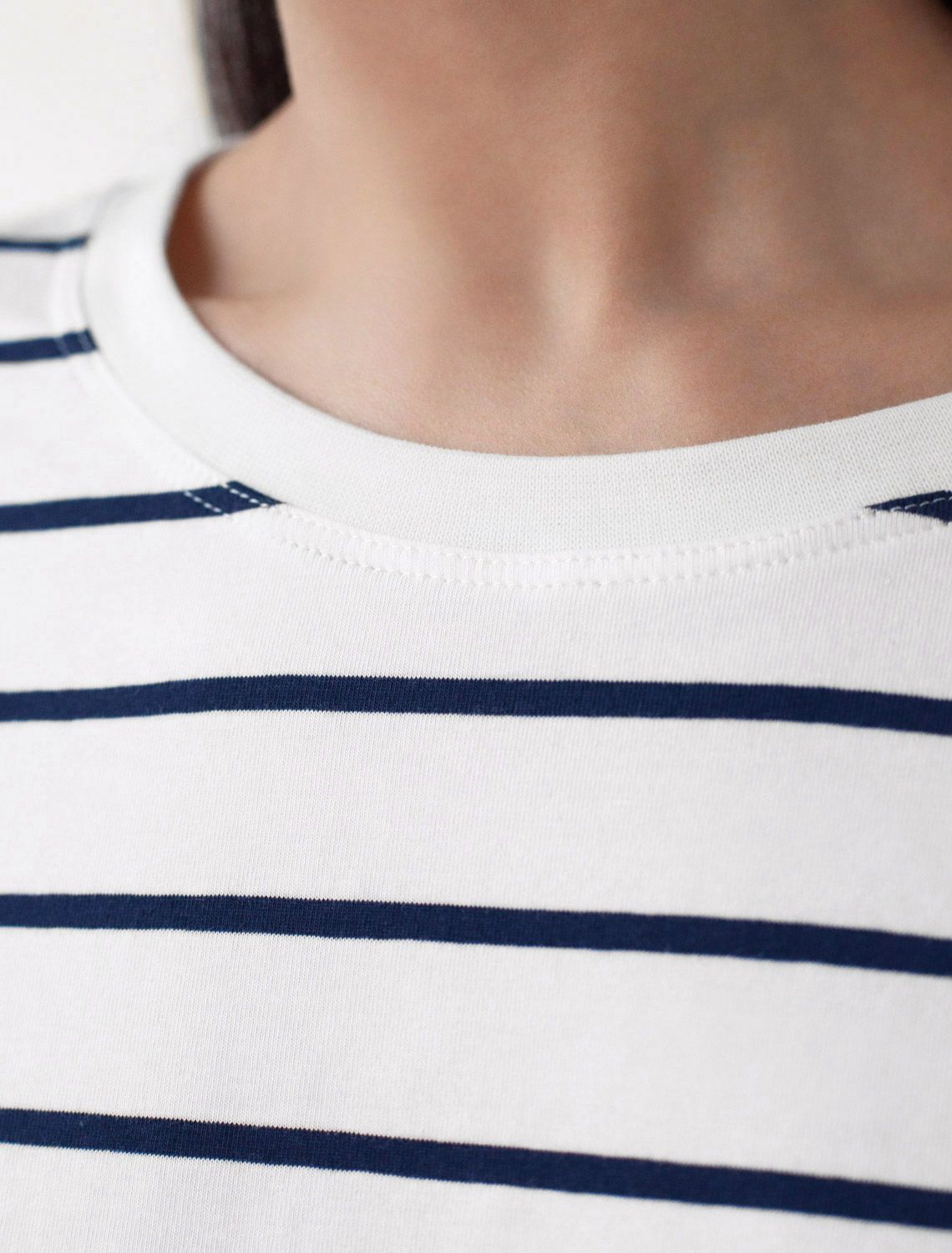 Свободный лонгслив белого цвета в темно-синюю полоску с длинным рукавом выполнен из премиального хлопка с добавлением эластана, плотностью 170 Г/м2, что обеспечивает комфорт и приятные тактильные ощущения. Принт полоска - придает изделию легкую текстурность и стильный вид, а круглый ворот создает универсальный образ, который подойдет для повседневного использования. Такой лонгслив идеально подходит для весеннего и летнего сезона благодаря легкой и дышащей ткани. Представленная широкая размерная линейка позволяет выбрать оптимальный вариант на любую фигуру, в том числе на плюс-сайз, обеспечивая свободу движений и удобство на каждый день. Этот комфортный лонгслив станет отличной базой в гардеробе, сочетаясь с различными стилями одежды и создавая простой, но эффектный образ. белый-т.синий