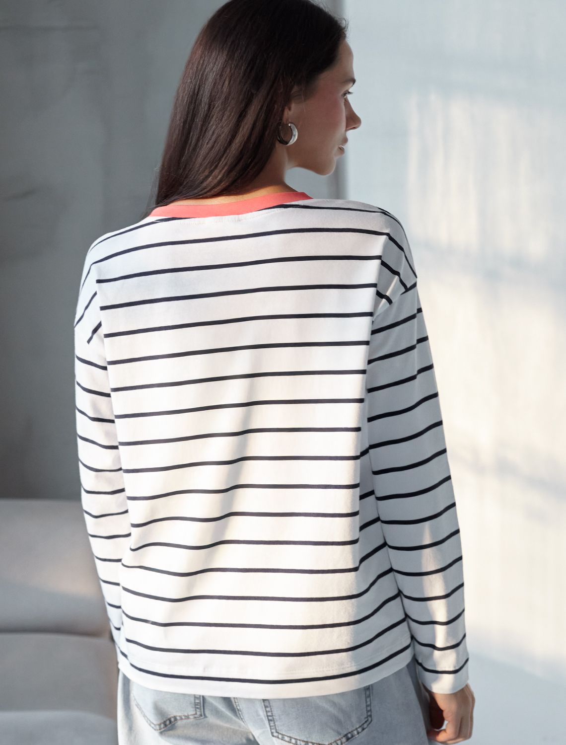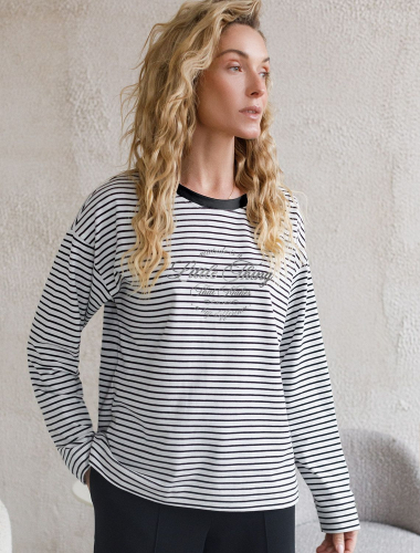 Свободный лонгслив белого цвета в темно-синюю полоску с длинным рукавом выполнен из премиального хлопка с добавлением эластана, плотностью 170 Г/м2, что обеспечивает комфорт и приятные тактильные ощущения. Полоска - придает изделию легкую текстурность, принт в виде цветка, который нанесен красками с устойчивым покрытием, добавляет стиля и индивидуальности, а круглый ворот создает универсальный образ, который подойдет для повседневного использования. Такой лонгслив идеально подходит для весеннего и летнего сезона благодаря легкой и дышащей ткани. Представленная широкая размерная линейка позволяет выбрать оптимальный вариант на любую фигуру, в том числе на плюс-сайз, обеспечивая свободу движений и удобство на каждый день. Этот комфортный лонгслив станет отличной базой в гардеробе, сочетаясь с различными стилями одежды и создавая простой, но эффектный образ.