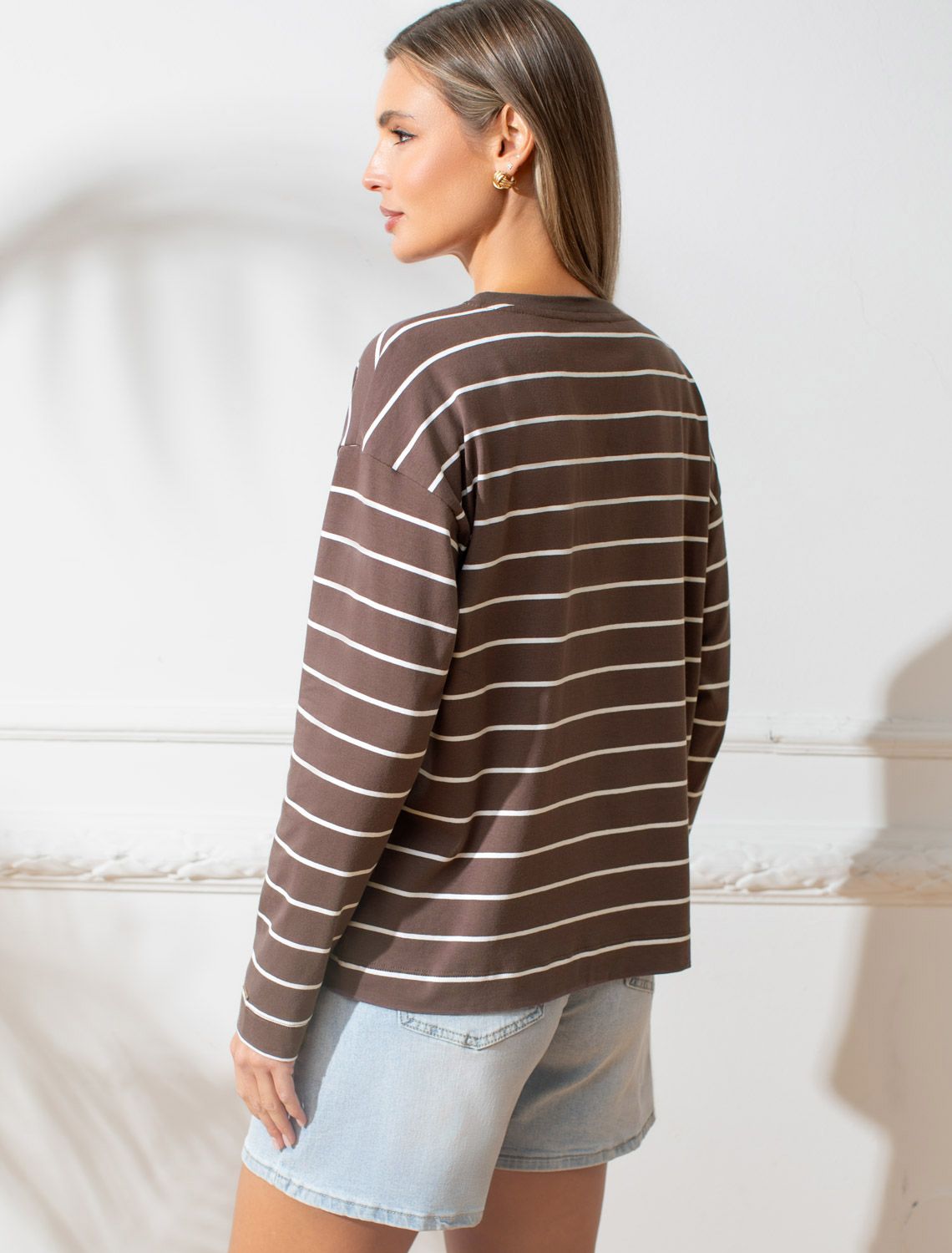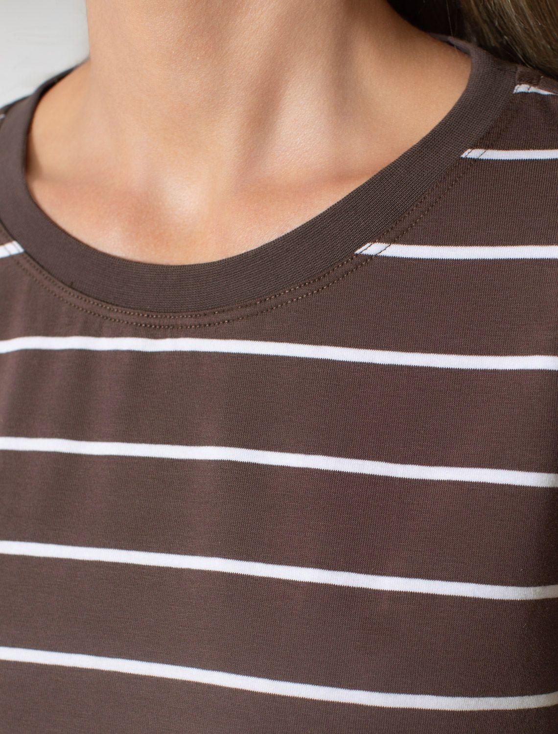 Свободный лонгслив кофейного цвета в белую полоску с длинным рукавом выполнен из премиального хлопка с добавлением эластана, плотностью 170 Г/м2, что обеспечивает комфорт и приятные тактильные ощущения. Полоска - придает изделию легкую текстурность и стильный вид, а круглый ворот создает универсальный образ, который подойдет для повседневного использования. Такой лонгслив идеально подходит для весеннего и летнего сезона благодаря легкой и дышащей ткани. Представленная широкая размерная линейка позволяет выбрать оптимальный вариант на любую фигуру, в том числе на плюс-сайз, обеспечивая свободу движений и удобство на каждый день. Этот комфортный лонгслив станет отличной базой в гардеробе, сочетаясь с различными стилями одежды и создавая простой, но эффектный образ.