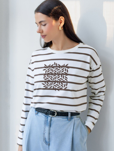 Лонгслив в полоску с принтом из премиального хлопка с эластаном D49.148 белый-кофе_листья