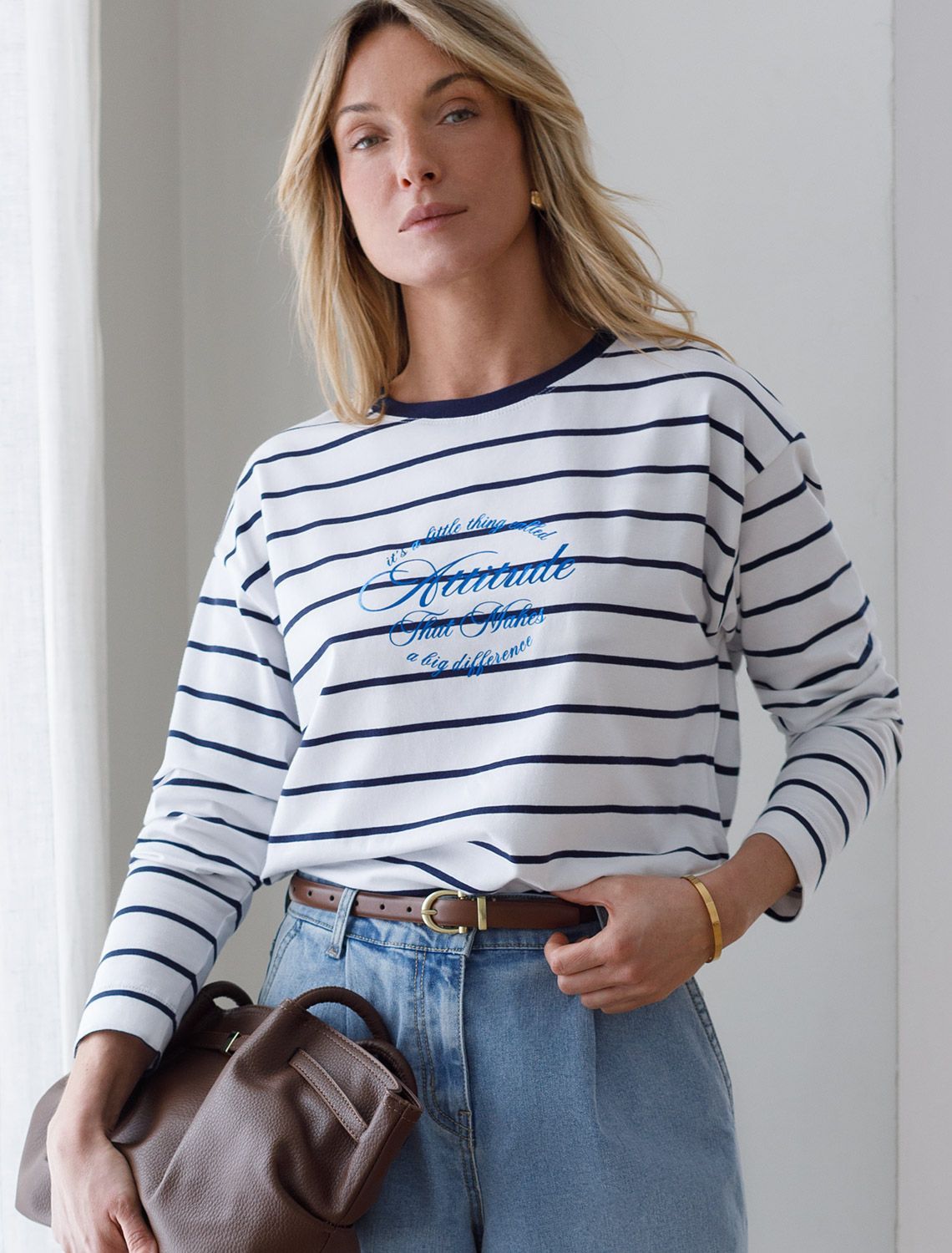 Свободный лонгслив белого цвета в темно-синюю полоску с длинным рукавом выполнен из премиального хлопка с добавлением эластана, плотностью 170 Г/м2, что обеспечивает комфорт и приятные тактильные ощущения. Полоска - придает изделию легкую текстурность, принт в виде надписи, который нанесен красками с устойчивым покрытием, добавляет стиля и индивидуальности. Перевод надписи: It is a litlle thing called attitude that makes a big difference - Это такая мелочь, как отношение, которое имеет большое значение. Круглый ворот создает универсальный образ, который подойдет для повседневного использования. Такой лонгслив идеально подходит для весеннего и летнего сезона благодаря легкой и дышащей ткани. Представленная широкая размерная линейка позволяет выбрать оптимальный вариант на любую фигуру, в том числе на плюс-сайз, обеспечивая свободу движений и удобство на каждый день. Этот комфортный лонгслив станет отличной базой в гардеробе, сочетаясь с различными стилями одежды и создавая простой, но эффектный образ.