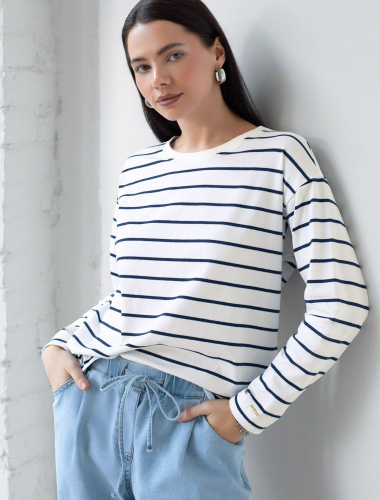 Свободный лонгслив в бело-черную тонкую полоску с рукавом средней длины выполнен из премиального хлопка с добавлением эластана, плотностью 170 Г/м2, что обеспечивает комфорт и приятные тактильные ощущения. Полоска - придает изделию легкую текстурность, аккуратная вышивка в виде букв логотипа бренда добавляет стиля и индивидуальности, а круглый ворот создает универсальный образ, который подойдет для повседневного использования. Объемные рукава буфы средней длины делают этот лонгслив женственным и изящным.Такой лонгслив идеально подходит для весеннего и летнего сезона благодаря легкой и дышащей ткани. Представленная широкая размерная линейка позволяет выбрать оптимальный вариант на любую фигуру, в том числе на плюс-сайз, обеспечивая свободу движений и удобство на каждый день. Этот комфортный тонкий джемпер станет отличной базой в гардеробе, сочетаясь с различными стилями одежды и создавая простой, но эффектный образ. белый-черный