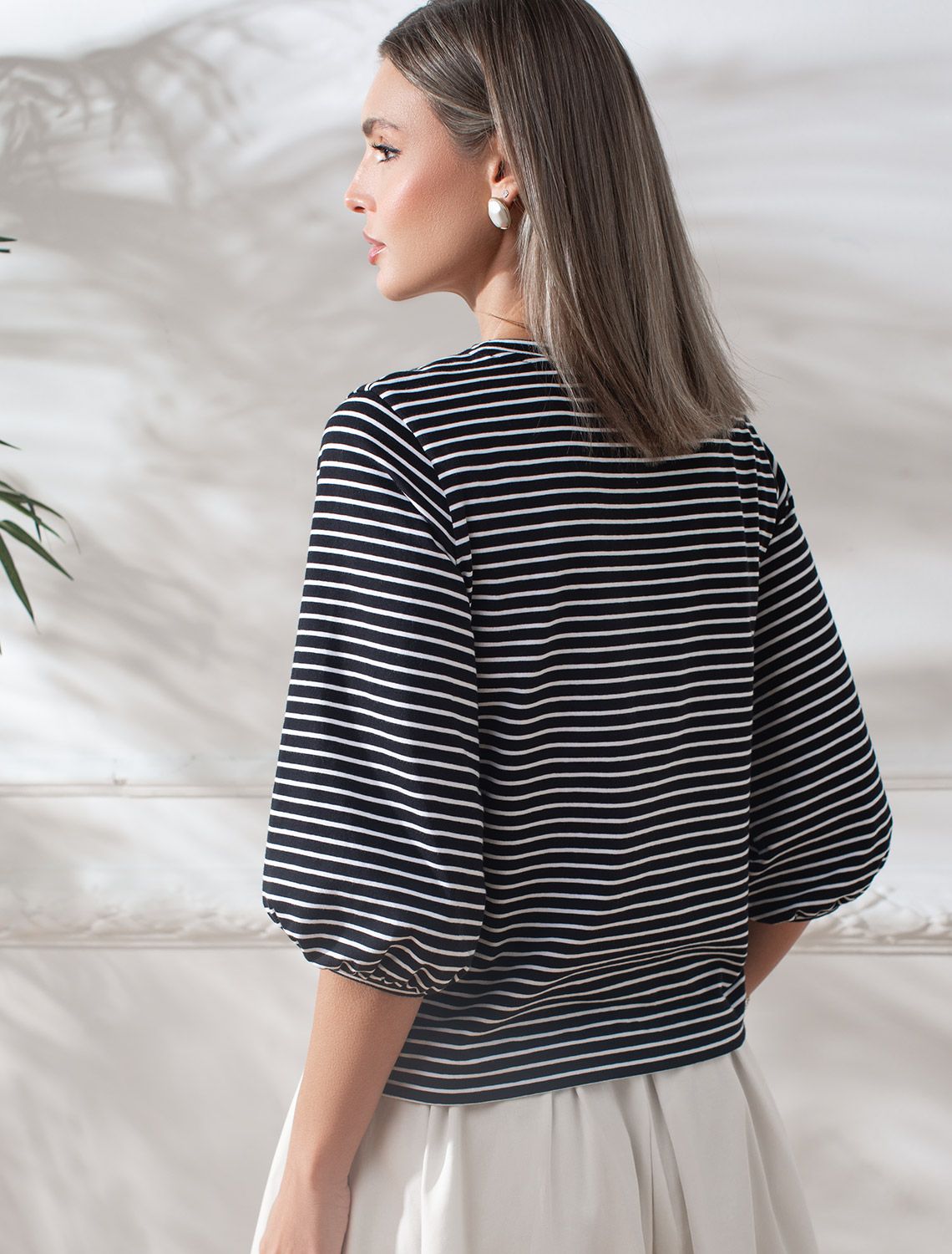 Лонгслив в полоску с рукавами-буфами из премиального хлопка с эластаном D49.149 черный-белый