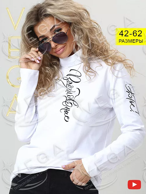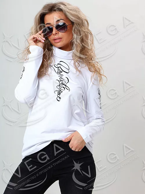 Стильный лонгслив сшит из ткани кулирка с лайкрой Fircha - имеет эффект бархата, за счёт чего он очень мягкий, приятный к телу и на ощупь. Станет прекрасным дополнением для вашего гардероба. Он отлично сочетает в себе все преимущества свитшота, джемпера, водолазки и кофты. Идеальный фасон длинный рукав в совокупности с воротником стойкой превосходно подойдет для любого события. Все дизайнеры мира сходятся во мнении, что воротник стойка подчёркнёт в образе женственность и элегантность. Именно поэтому мы использовали такой фасон при создании данной модели. И наши клиенты подтверждают, что мы не ошиблись с выбором. Надев лонгслив с пиджаком, Вы создадите образ деловой и стильной девушки. А если Вы решите надеть его с джинсами и кроссовками и отправиться на прогулку, то получится образ утончённый и романтический. Можно купить лонгсливы и белого, и чёрного цвета. Каждый из них по своему хорош. Стильный принт дополнит Ваш образ. Мягкая хлопковая ткань водолазки приятная на ощупь и не нарушает воздухообмен, поэтому в ней тепло, когда на улице мороз и прохладно в жарком помещении. Добавление небольшого количества полиэстера продлевает изделию жизнь, позволяет сохранять идеальную форму и садится прекрасно по фигуре.