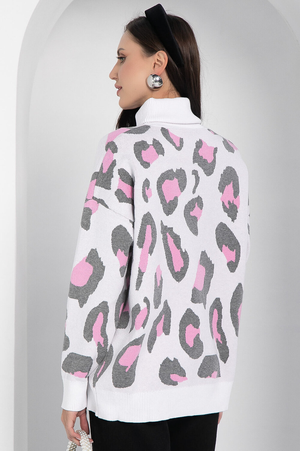 Джемпер прямого кроя с длинными рукавами — воплощение комфорта и тепла. Он мягкий и приятный на ощупь, что делает его идеальным выбором для повседневной носки. Свободный крой и спущенная линия плеча создают ощущение простора и свободы движений. Вы будете чувствовать себя комфортно в любой ситуации. Высокий ворот-хомут не только добавляет стильный акцент, но и надёжно защищает от холода. Леопардовый принт придаёт дерзости и оригинальности. Наденьте этот джемпер и наслаждайтесь его уютом!