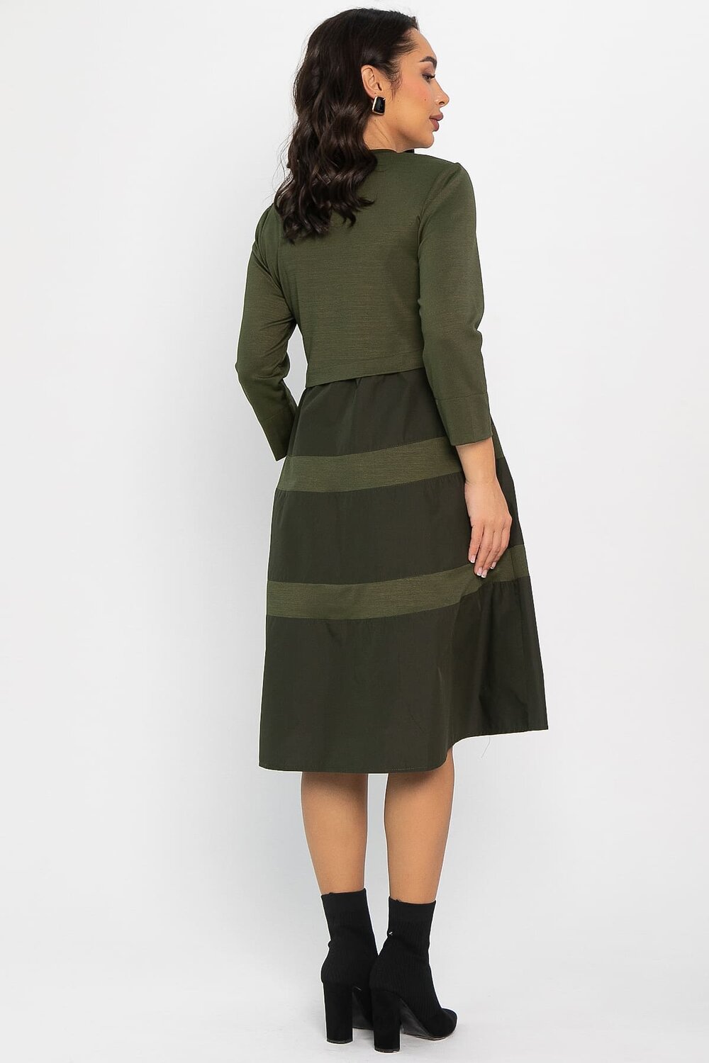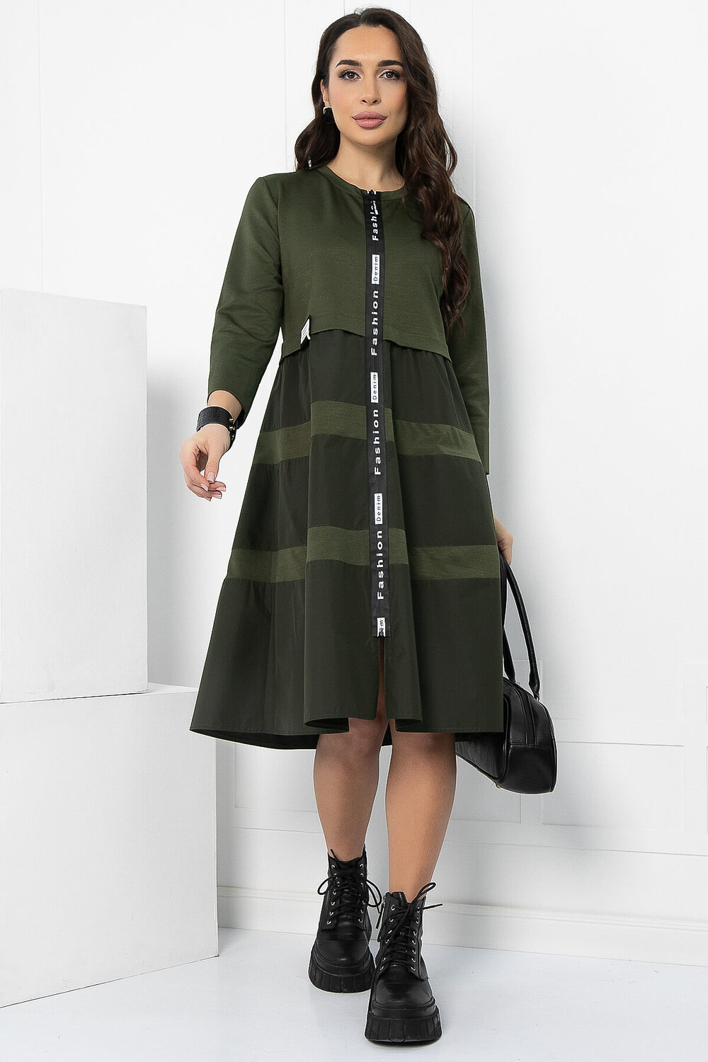 Повседневное платье в стиле спорт-шик, выполненное из сочетания плотного трикотажа и плащевки. Платье отрезное по линии талии, юбка состоит из ярусов. Такой фасон прекрасно подойдёт для повседневных мероприятий, будет хорошо сочетаться как с обувью на плоской подошве, так и с каблуком. Плащевка неприхотлива в уходе, любые брызги или капли с неё можно удалить обычной влажной салфеткой. Молния по всей длине платья также является декоративным элементом.