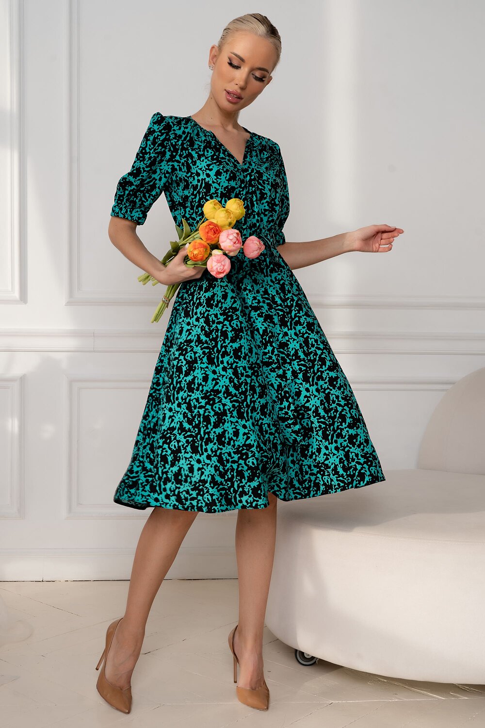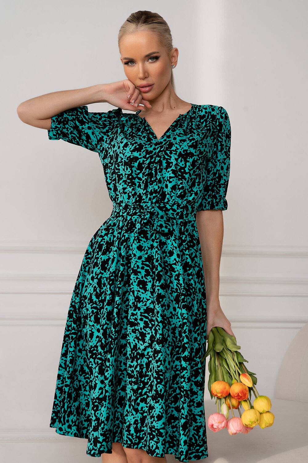 Изящное платье, сотканное из нежнейшей ткани штапель, станет воплощением легкости и женственности в вашем гардеробе. Легкий и дышащий материал идеально подходит для теплых дней, даря ощущение комфорта и свободы движений. Рукав, собранный на эластичную резинку, добавляет образу романтичности и кокетства. Он плавно облегает руку, не сковывая движений, и создает воздушный силуэт. Резинка позволяет регулировать длину рукава, подстраивая его под ваше настроение и погоду. Талия, подчеркнутая эластичной резинкой, формирует изящный силуэт, выгодно подчеркивая достоинства фигуры. Резинка обеспечивает комфортную посадку и свободу движений, не стесняя в течение дня. В комплекте с платьем идет элегантный поясок, который позволяет акцентировать талию и придать образу завершенность. Поясок можно завязать на бант или узел, создавая различные варианты стилизации. Он добавляет платью нотку изысканности и позволяет подчеркнуть индивидуальность. Это платье – идеальный выбор для тех, кто ценит комфорт, стиль и женственность. Оно подойдет как для повседневной носки, так и для особых случаев. Легкое, воздушное и невероятно красивое, оно станет вашим любимым нарядом.
