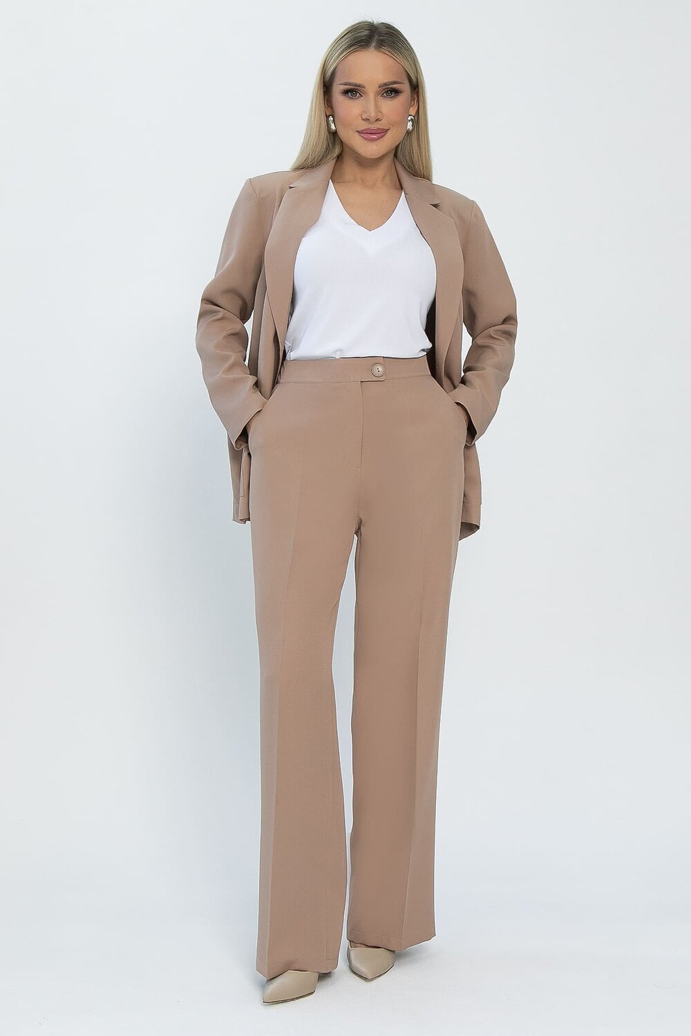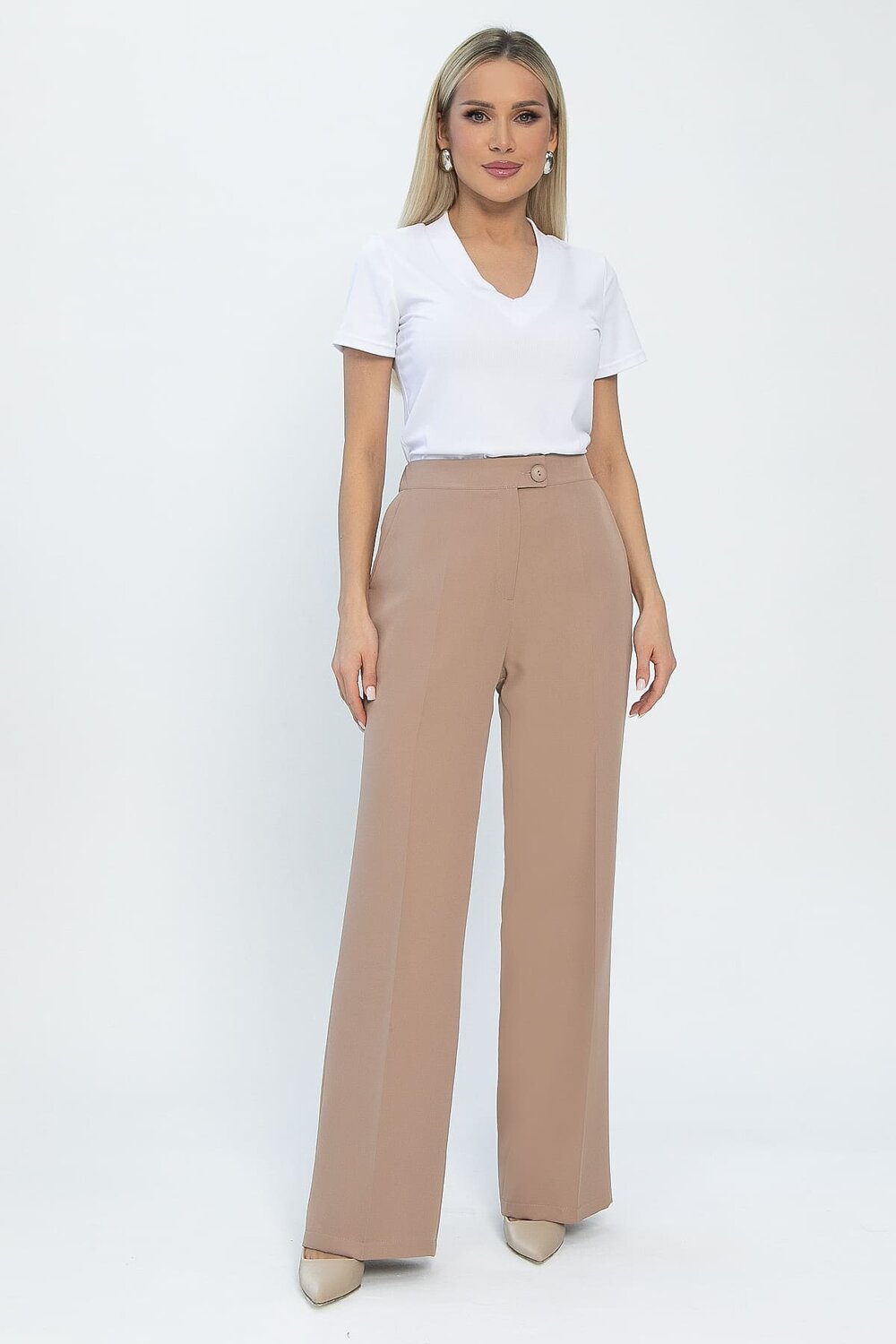 Элегантные классические брюки в оттенке мокко – основа вашего стильного гардероба! Высокая посадка выгодно подчеркивает талию, создавая женственный и утонченный силуэт. Для идеальной посадки по фигуре предусмотрена резинка по спинке пояса. Заутюженные стрелки визуально удлиняют ноги и придают брюкам строгий классический вид. Надежная застежка на молнию и пуговицу обеспечивает комфорт и уверенность в течение дня. Прекрасно вписываются в офисный дресс-код, идеально подходят для важных деловых встреч и добавляют элегантности вашему образу на особых мероприятиях.