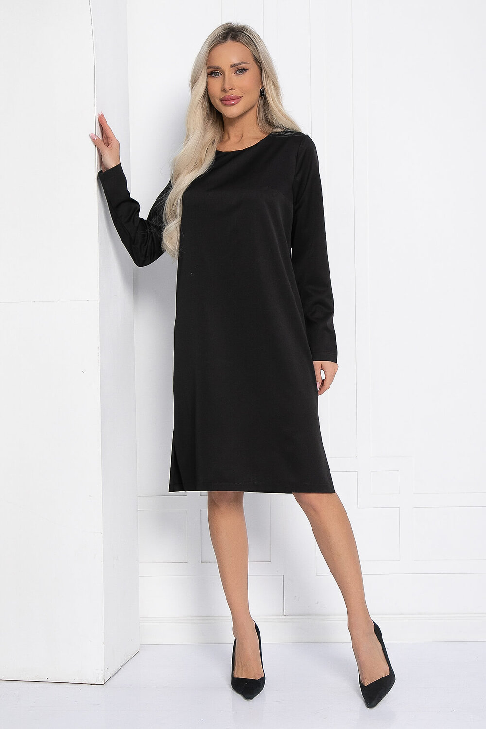 Элегантное чёрное платье — это настоящий must-have для современных женщин, стремящихся выглядеть стильно. Округлая горловина и длинные рукава делают его невероятно утончённым, а пояс из экокожи, который идёт в комплекте, подчеркивает талию. Это платье идеально подходит для любого случая: будь то деловая встреча в офисе, вечеринка с друзьями или обычная прогулка.
