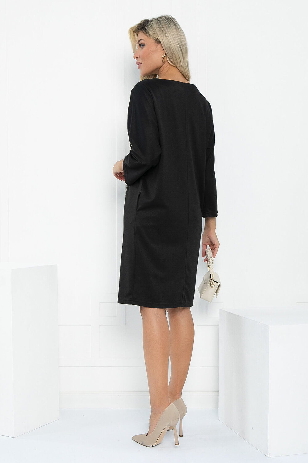 Стильное платье силуэта «бочонок», длиной выше колена, с рукавом три четверти. Такое платье универсально, ведь оно уместно в совершенно разных ситуациях. Подходит женщинам, девушкам и подросткам с любым ростом, беременным и мамам на выписку, идеально смотрится как на торжественном мероприятии, так и в повседневной жизни благодаря игре аксессуаров.