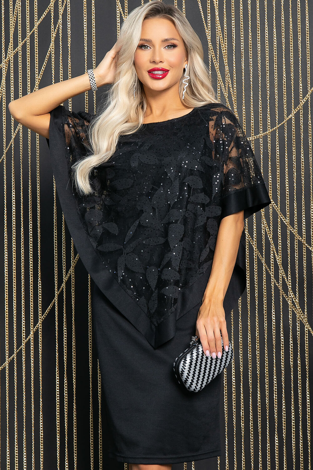 Уникальное вечернее платье, созданное для самых очаровательных леди. Оно состоит из двух частей: облегающего платья и накидки из сетки, расшитой пайетками. В сочетании с туфлями-лодочками этот наряд станет настоящим шедевром! Обратите внимание, что накидка не снимается.