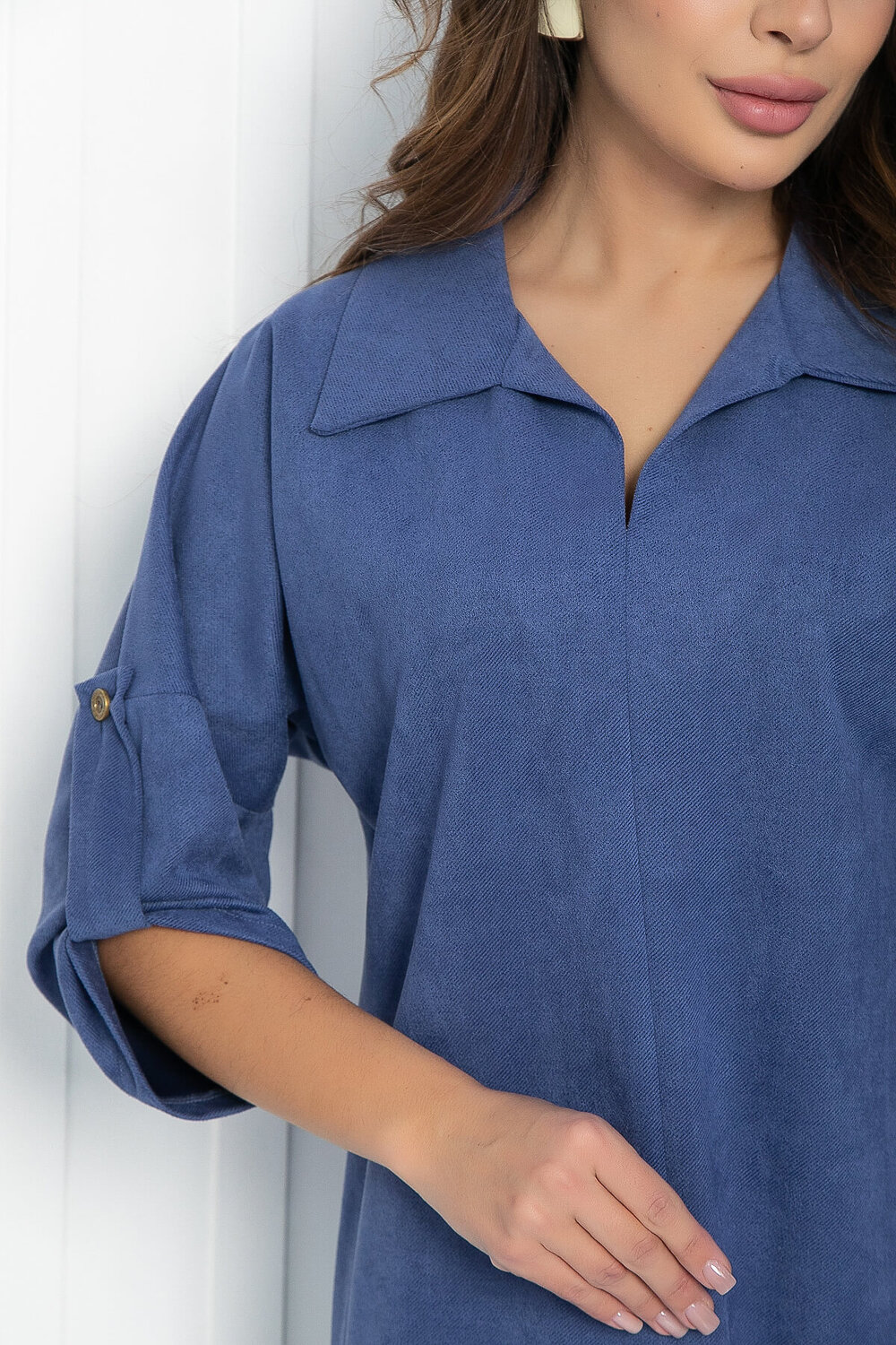 Комфортное платье свободного кроя со спущенным плечом. Отлично подойдет как для повседневной носки, так и для особых случаев. Выполнено из трикотажа с эффектом замши. Рукав собран на пату и закреплен пуговицей. В комплекте идёт пояс из основной ткани.