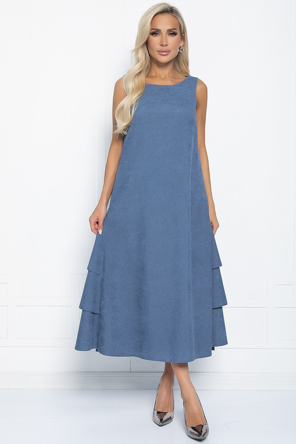 Платье со вставками в виде нескольких ярусов — необычная модель в романтическом стиле, которая позволит выглядеть женственно и привлекательно каждый день. Фасон А-силуэта без рукавов плавно расклешается к низу, не подчеркивает нюансы фигуры, позволяет чувствовать себя комфортно и уверенно. Главный акцент платья — боковые вставки в виде клиньев, которые добавляют образу легкости и создают эффект летящей походки.