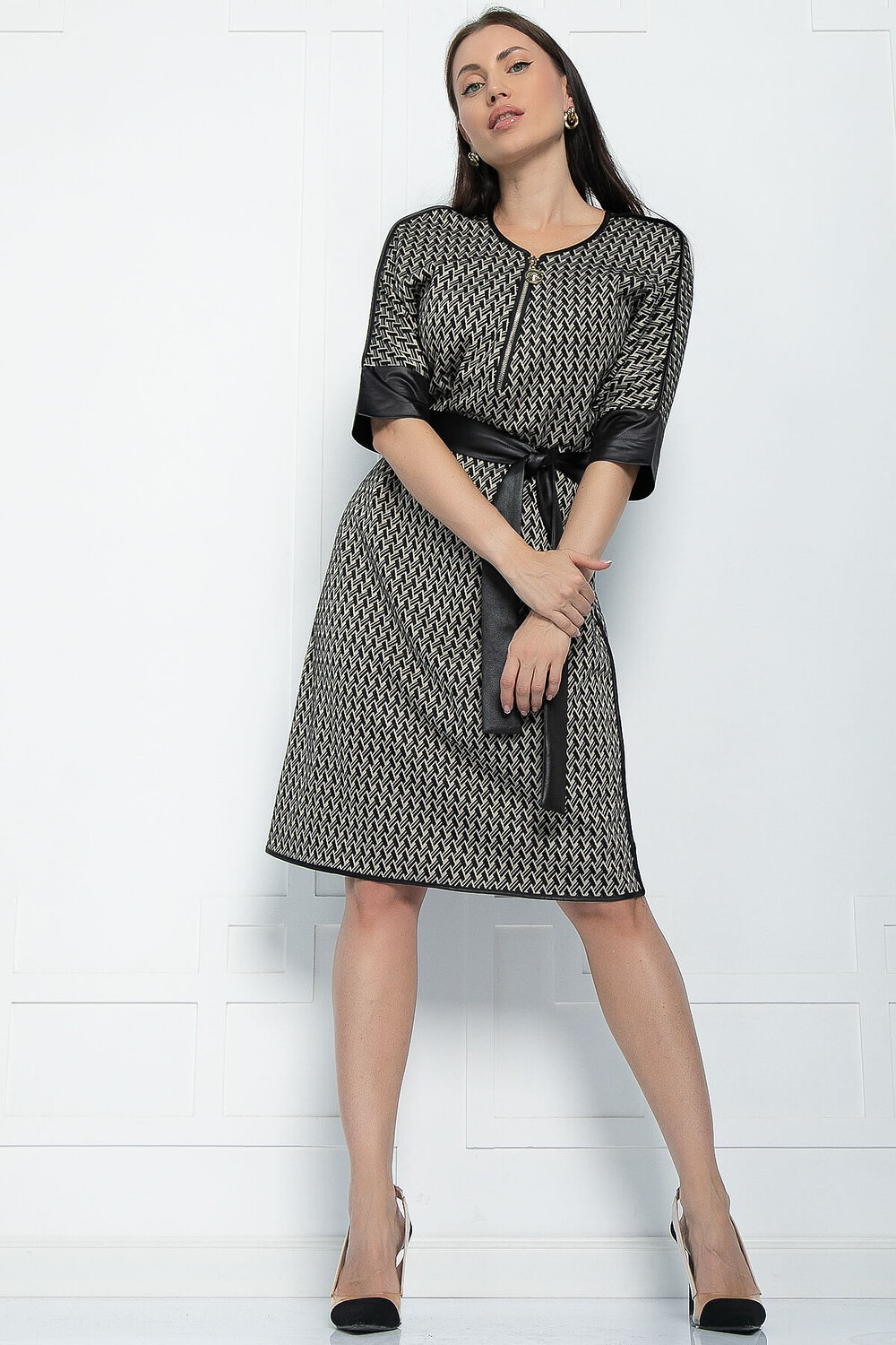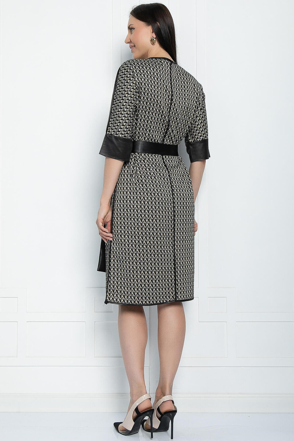Стильное трикотажное платье полуприлегающего силуэта — это удобная и универсальная вещь. Оно подходит для повседневной носки и встреч с подругами. Округлый вырез с V-образным элементом придаёт образу особую изюминку.