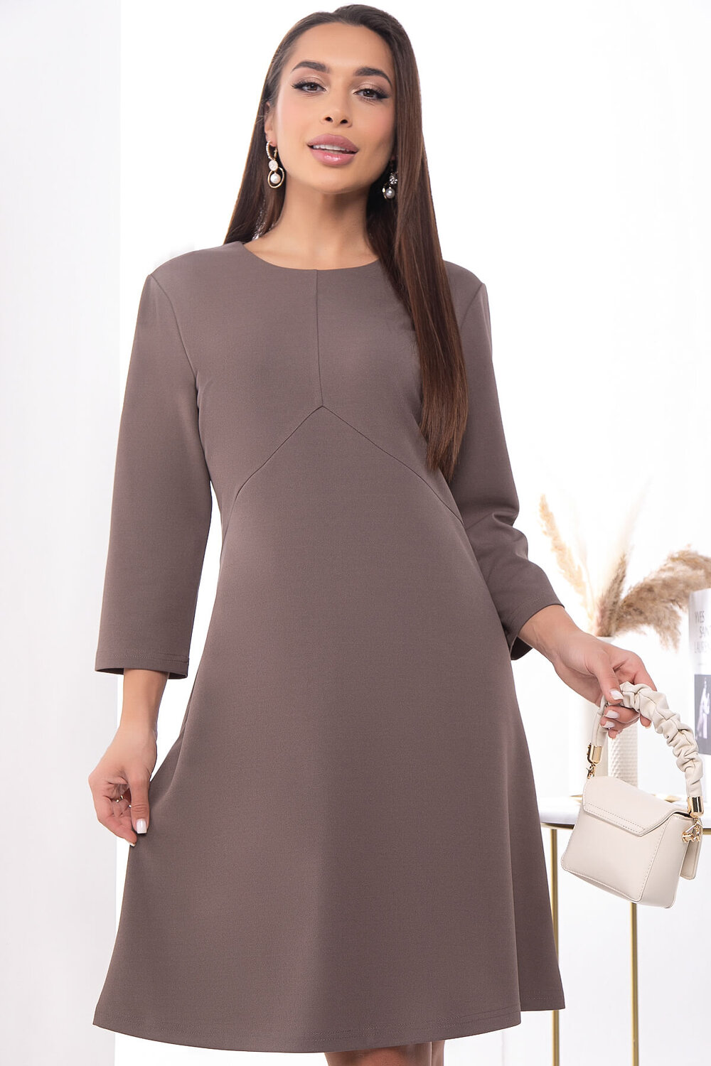 Базовое платье всегда выглядит роскошно благодаря своей лаконичности. Данная модель представлена в красивом оттенке, который так замечательно подойдёт для создания красивых осенних образов. Платье имеет втачной рукав комфортной длины три четверти.