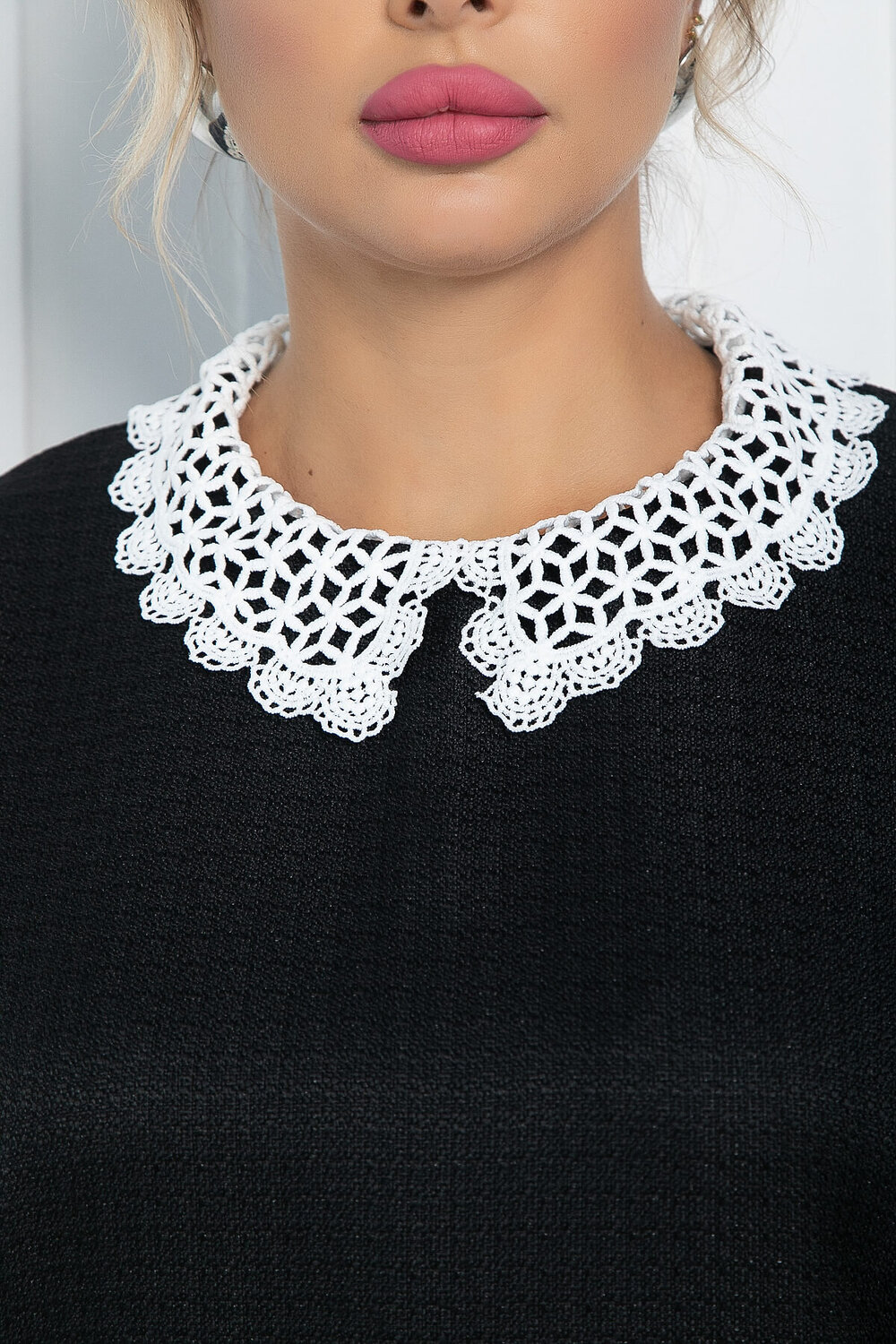 В гардеробе каждой девушки должно быть чёрное платье. Оно имеет декоративный воротник белого цвета, украшенный нежным кружевом. Воротник съёмный, поэтому платье можно будет носить и после мероприятия, не пряча его в шкаф. Универсальный крой модели позволяет создавать элегантные повседневные образы.