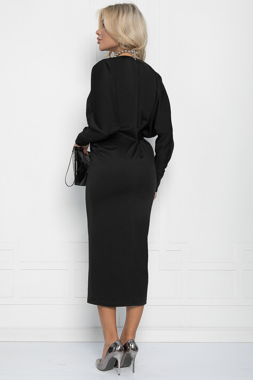 Платье покроя «летучая мышь» станет отличным выбором для особых случаев! Его изюминка — оригинальный поясок, который завязывается с одного бока, создавая эффект асимметрии.