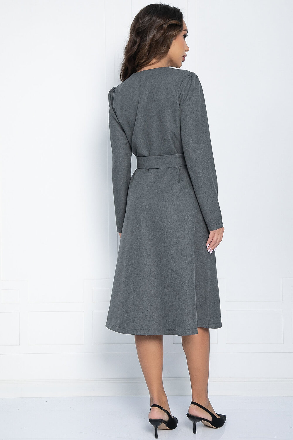 Платье идеально подходит для работы в офисе и повседневной носки, а также для особых случаев, например, для похода в театр. Оно отрезное по талии, юбка расширяется книзу. Длинные рукава. По бокам расположены шлевки для пояса. В комплект входит пояс из основной ткани, который поможет подчеркнуть вашу талию.