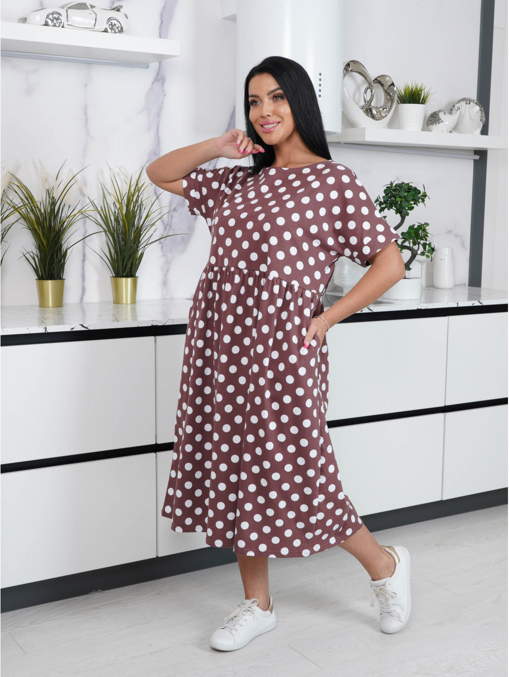 Перед Вами платье Люция свободного кроя, с отрезным лифом с цельнокроеными рукавами. На сборенной по талии юбке в боковых швах выполнены внутренние карманы.
