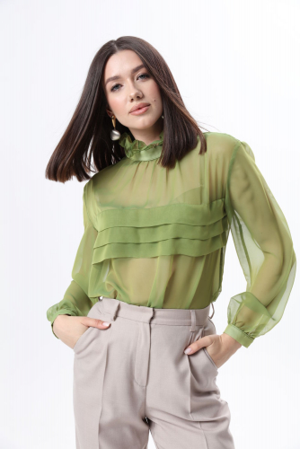 Брюки прямого силуэта из хлопковой  ткани. По верху брюк притачной пояс с застежкой на петлю и пуговицу и шлевками для ремня. На передних половинках обработаны карманы и застежка молния в среднем шве. На задних - кокетка и карманы. Низ брюк без обработки.