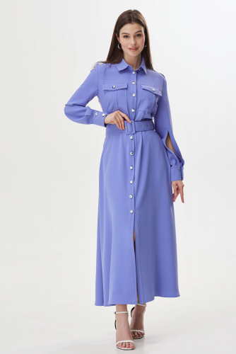 Стильное платье полуприлегающего силуэта, расширенное к низу из струящейся ткани. Воротник рубашечного типа с застежкой на петли и пуговицы. Рукав втачной длинный с декоративным разрезом, по низу манжета с застежкой на петли и пуговицы. По переду и спинке на линии талии подрез. Лиф переда с накладными карманами и клапанами. На плечевых швах расположены декоративные пагоны с пуговицами. В боковых швах функциональные карманы. В комплект входит съемный ремень. Обращаем ваше внимание, что фурнитура может незначительно отличаться от фото.