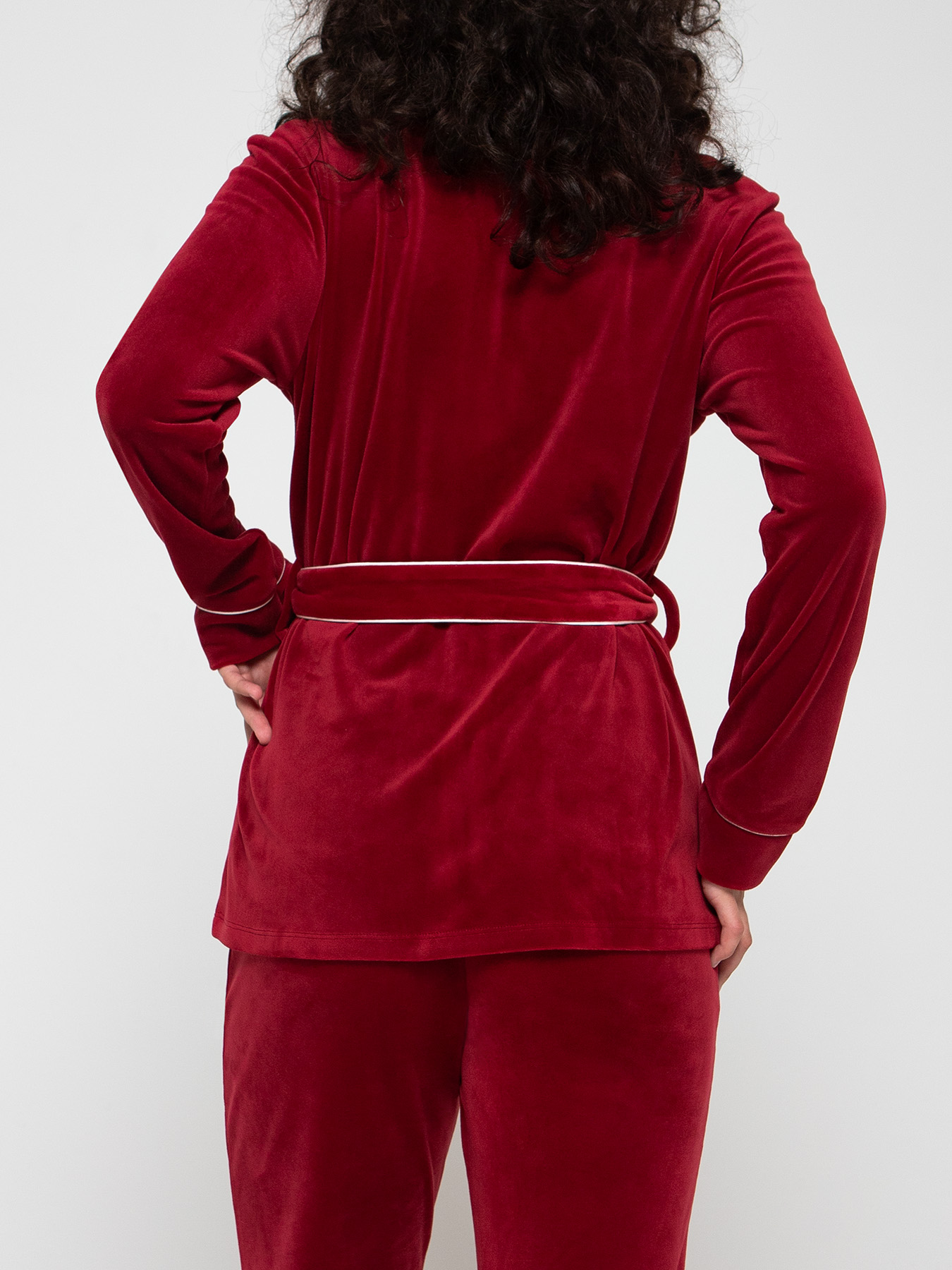 Бесподобный роскошный домашний костюм: жакет и брюки. Выполнен из трикотажного бархатного велюра поистине королевского цвета бургунде. Особенно изысканно этот цвет смотрится в сочетании с белым атласным кантом, который присутствует в отделке костюма, и перламутровыми пуговицами. Брюки прямого силуэта, на резинке. Жакет с английским отложным воротником, накладными карманами, мягким поясом.