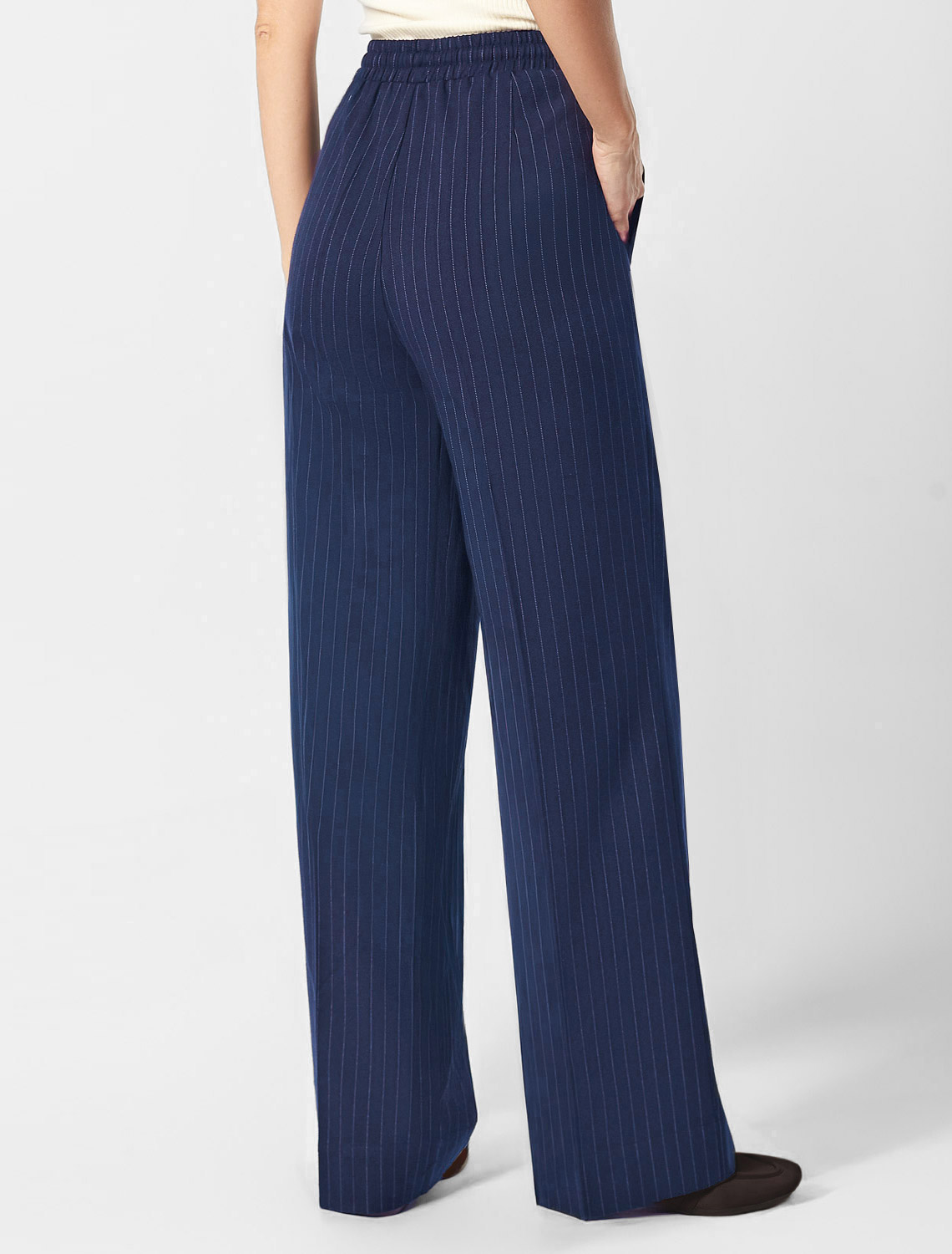 Брюки свободного кроя выполнены из костюмной ткани в полоску. Модель с карманами и поясом на резинке дополнена регулируемым шнурком из основной ткани. Изделие не сковывает движений и подходит для любого типа фигуры. Сочетается в костюме с жилетом D27.001