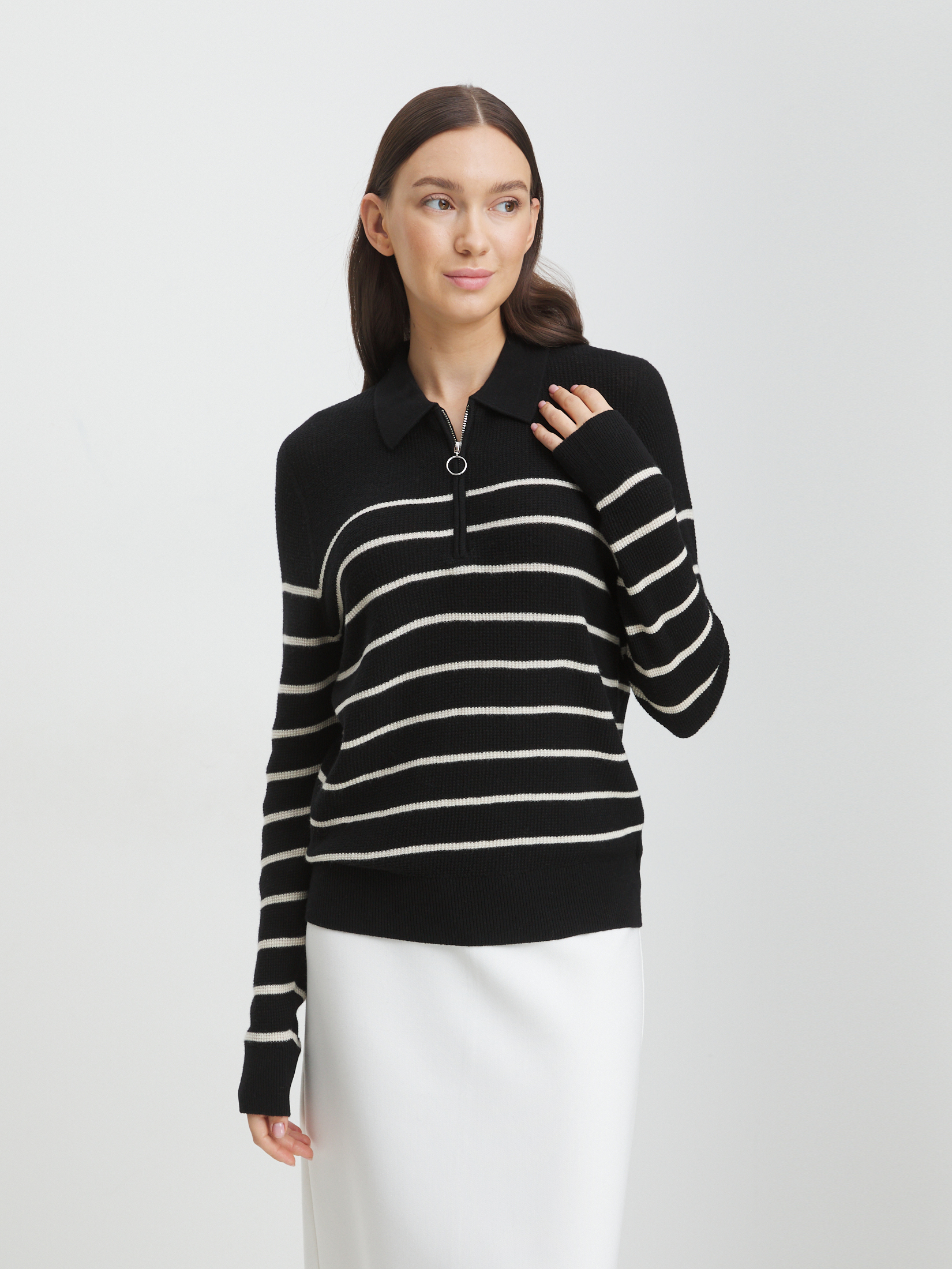Модель создана из 100% шерсти мериноса – натурального материала, который получают от особой породы тонкорунных овец. Шерсть мериноса ценится за нежность, мягкость и эластичность. Натуральная шерсть пропускает воздух, не создавая парникового эффекта, поэтому ваша кожа останется сухой. В шерстяных вещах тепло, но не жарко. У волокон мериноса есть завитки, похожие на пружинки. Грязь не проникает в них, а остается снаружи, благодаря чему шерстяные вещи долго остаются свежими.