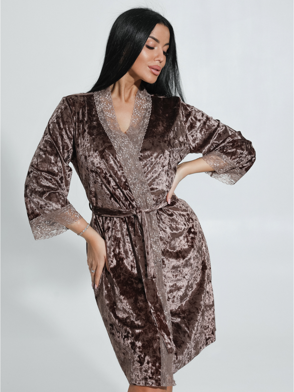 Пеньюар – лучшее модное изобретение, способное подчеркнуть женскую сексуальность. Он может стать изюминкой любого образа, подарить женщине уверенность в себе и любовь мужчины. Представляем Вам очаровательный комплект из роскошного бархата с отделкой из мягкого кружева. Он состоит из двух предметов: халат-пеньюар и сорочка на тонких бретельках.