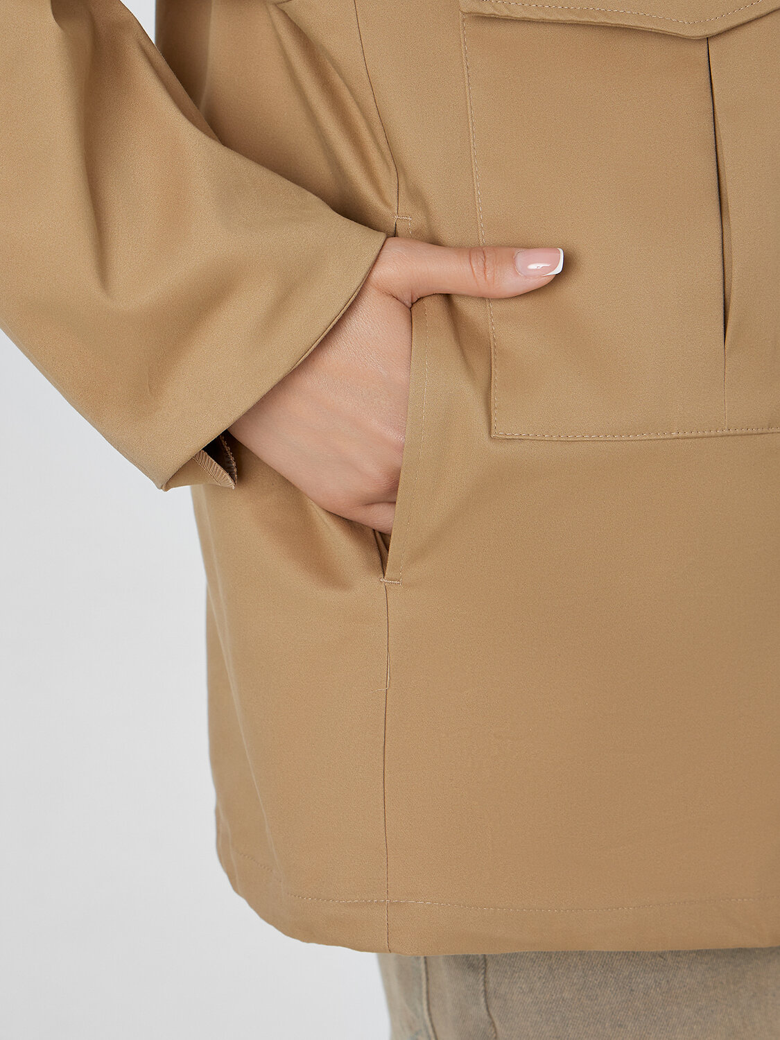 Воротник со стойкой и декоративным элементом добавляет куртке индивидуальности. Центральная молния, накладные карманы с клапанами и боковые карманы делают анорак практичным для повседневной носки — в них удобно хранить телефон, ключи или руки. Низ куртки обработан эластичной резинкой, которая мягко фиксирует изделие по фигуре.