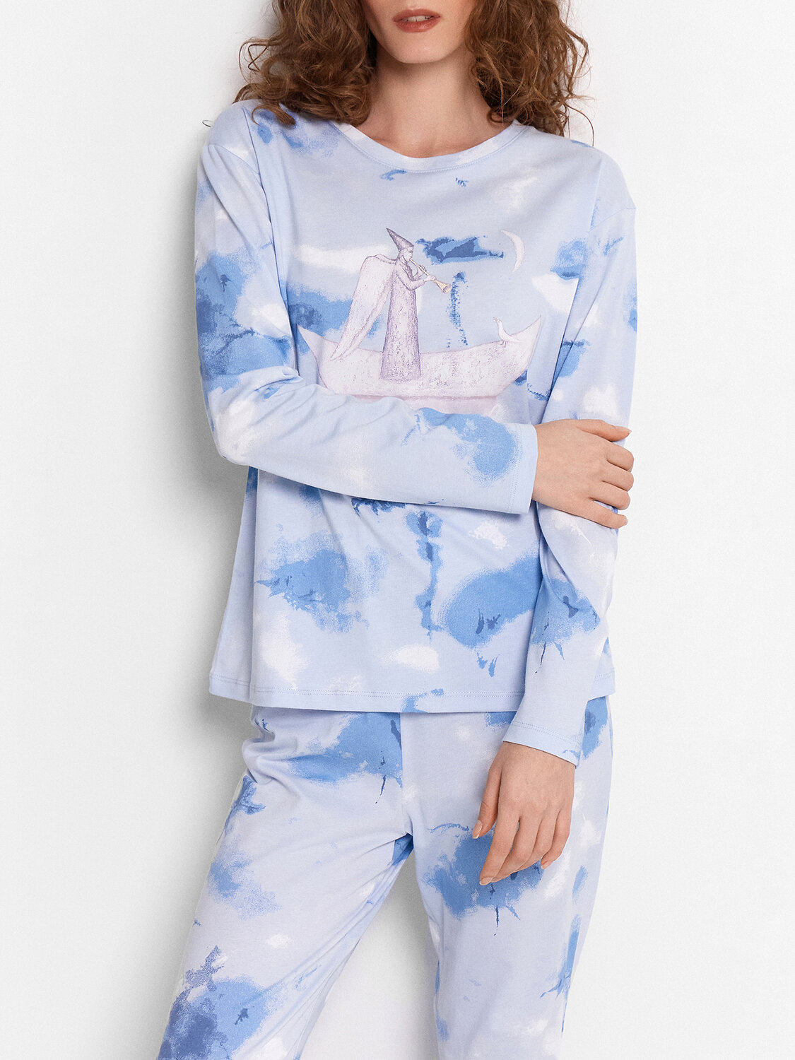 Женская пижама, выполненная из хлопковой кулирки. Модель идеально сочетает в себе комфорт и элегантность, обеспечивая непревзойденное ощущение уюта. Джемпер прямого кроя с круглой горловиной и длинными рукавами обеспечивает свободу движений и уют. Брюки длинные, немного зауженные к низу, с эластичным поясом, прекрасно сидят на фигуре и добавляют комфорта. Хлопковая кулирка - материал, который отличается мягкостью, воздухопроницаемостью и приятной текстурой. Она обеспечивает комфорт и удобство на протяжении всего времени ношения, создавая идеальные условия для спокойного сна. Эта пижама станет вашим любимым выбором для комфортных ночей и расслабленного отдыха дома.