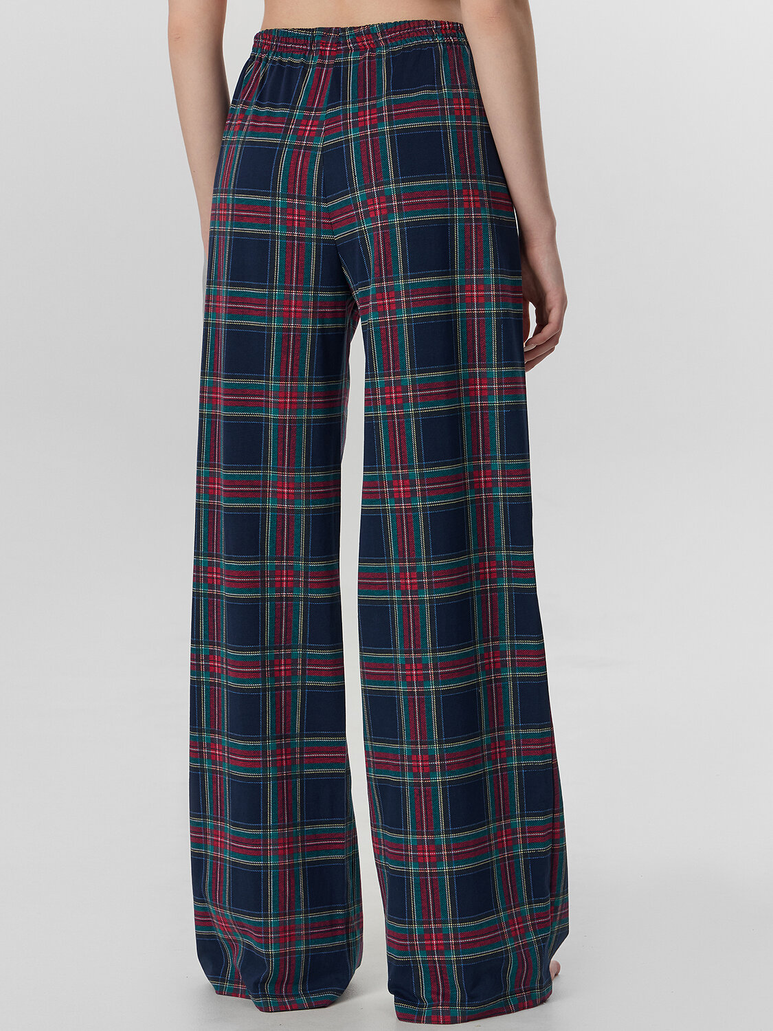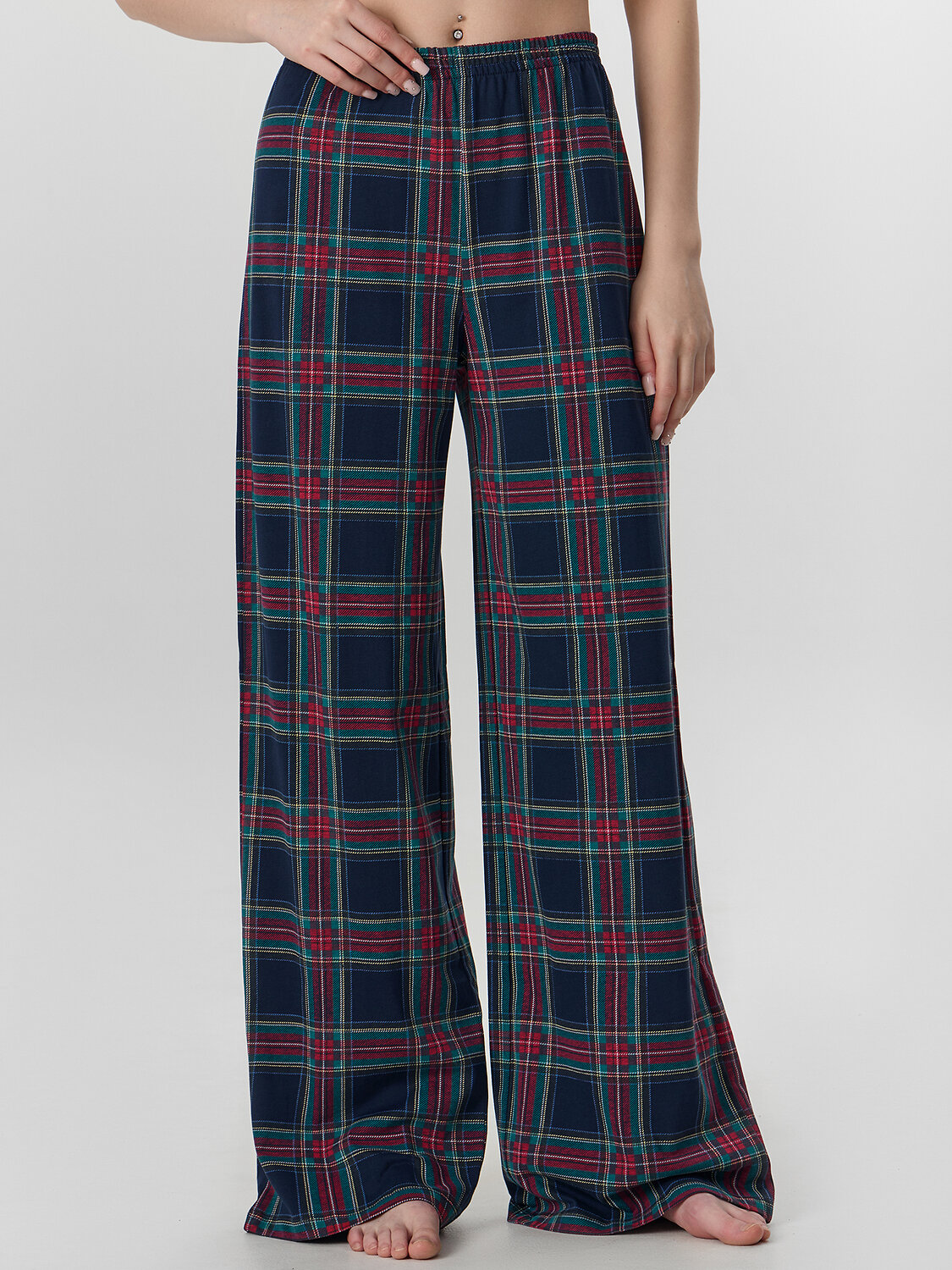 Брюки свободного силуэта. Пояс цельнокроеный, с втачной эластичной