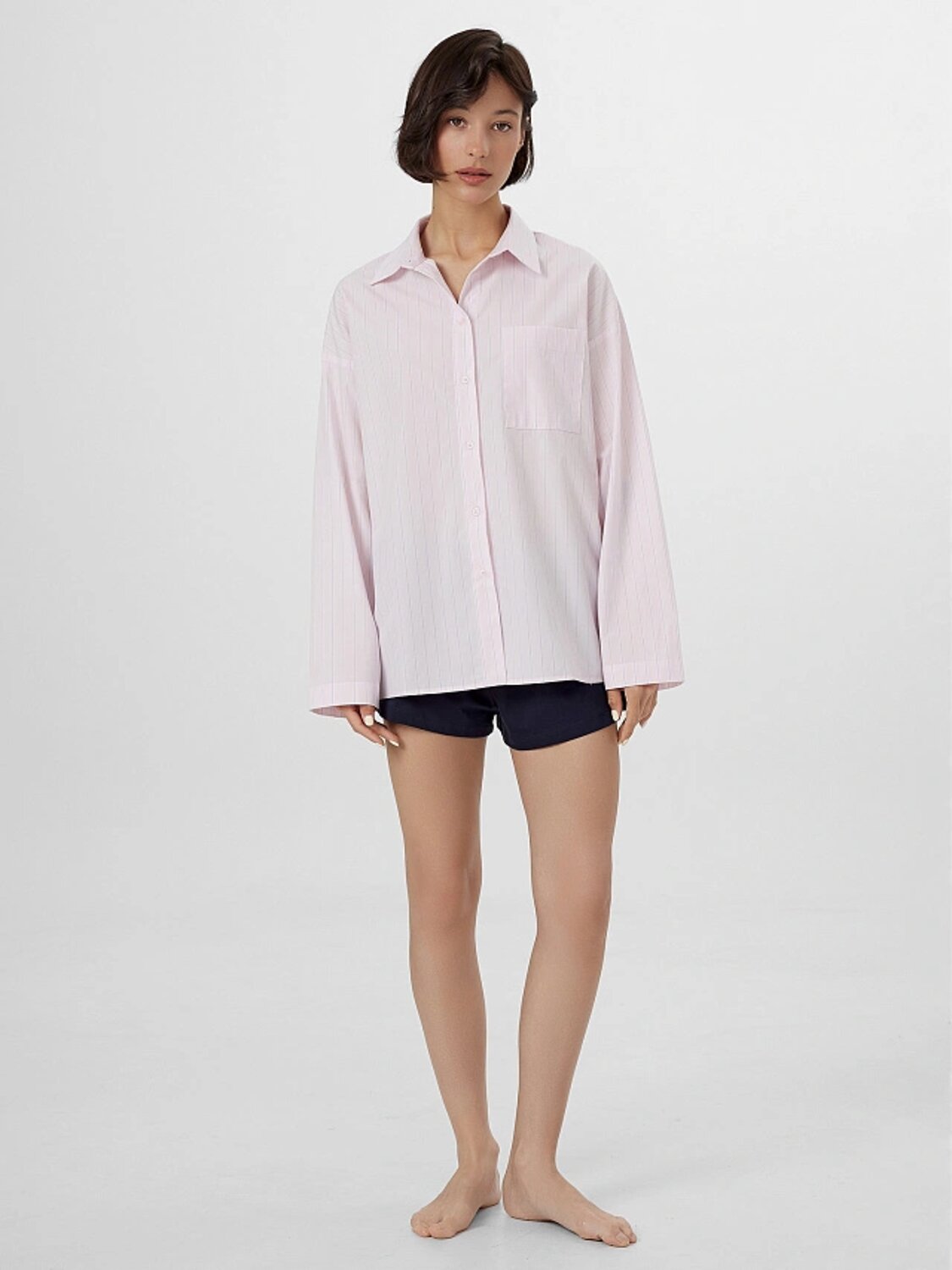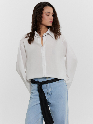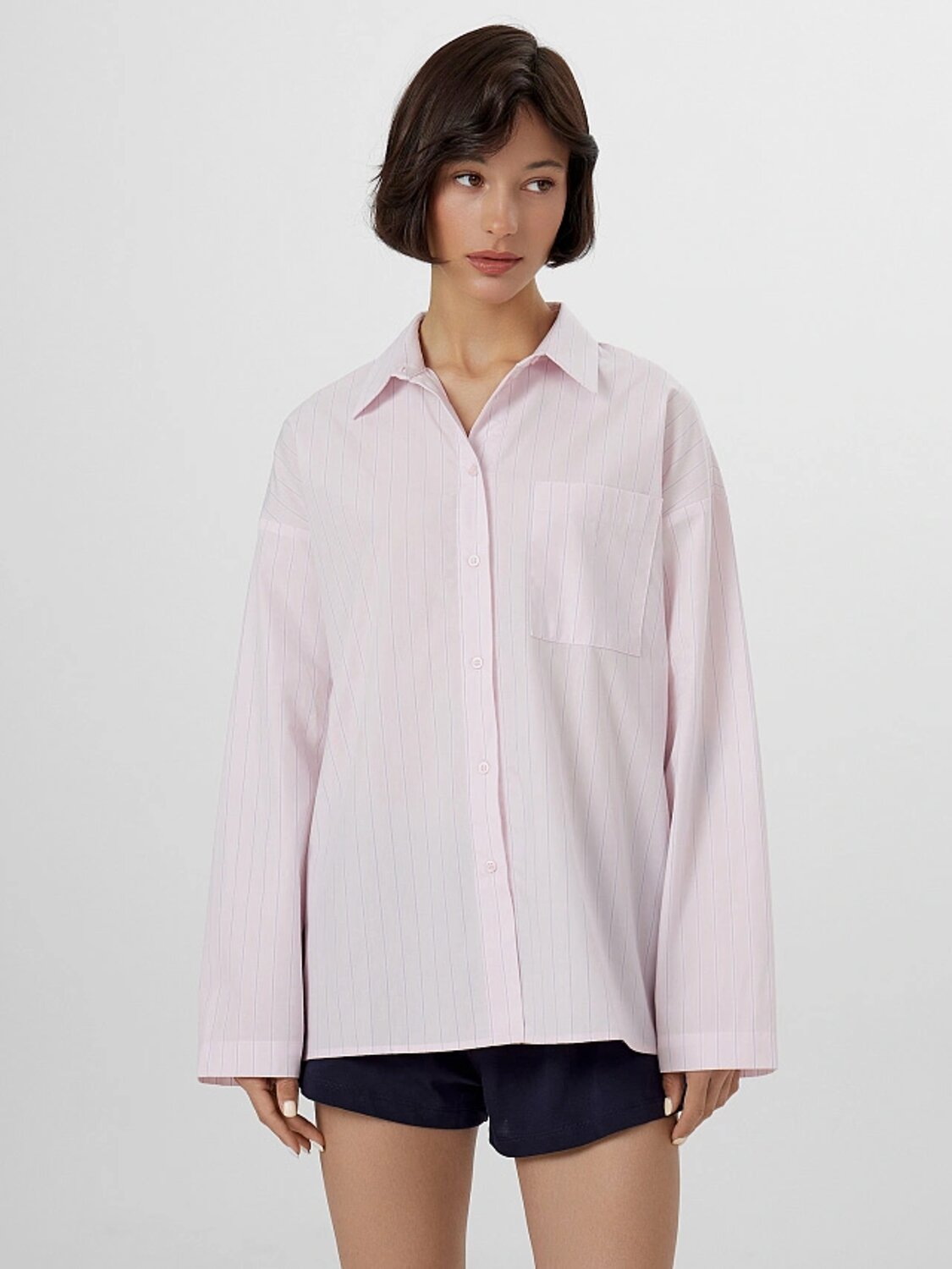 Эта женская рубашка воплощает комфорт и лаконичность. Свободный силуэт позволяет чувствовать себя непринужденно, не жертвуя стилем. Спущенное плечо и длинные рукава добавляют расслабленного шарма, а классический воротник и застежка на пуговицах придают модели нотку строгости. Хлопковая ткань — гарантия мягкости, дышащих свойств и повседневной практичности. Накладной карман — небольшой, но выразительный штрих, придающий рубашке визуальный акцент. Обработка краев делает изделие аккуратным и завершенным, а прямой низ оставляет простор для разных стилистических решений — от классики до кэжуал.