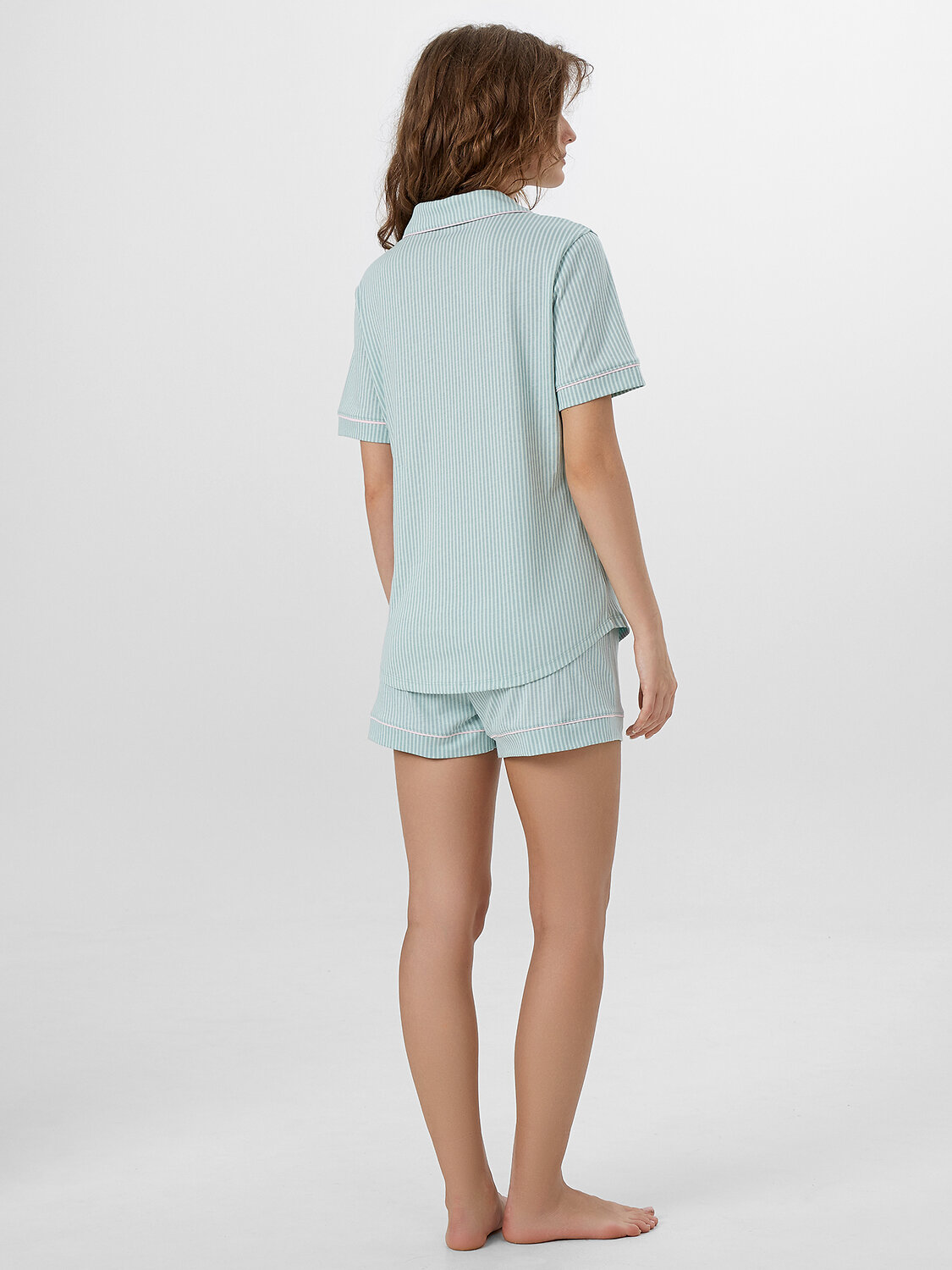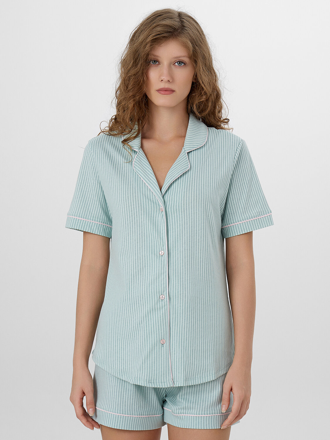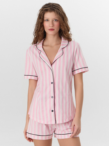 Комфортная пижама женская в "костюмном стиле" из высококачественного хлопка для приятных снов и домашних дел. Жакет прямой, с отложным воротником и лацканами, короткими рукавами, застегивается на пуговицы. Дополняют его свободные шорты длины мини, с резиновой тесьмой в поясе и атласной тесьмой, которая завязывается на бантик. Особенность модели – контрастные канты на рукавах, воротнике и передней части рубашки. В пижаме абсолютно не жарко, комфортный материал не сковывает движений. Красивая и интересная модель на каждый день. В линейке много актуальных расцветок, широкий размерный ряд, есть варианты для девушек с пышными формами plus-size. Лучший выбор домашней одежды на каждый день от Mark Formelle. Рекомендуем!