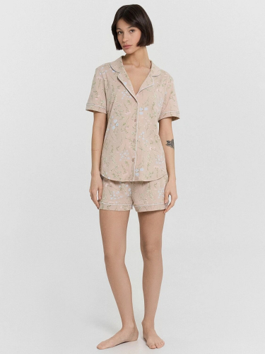 Хлопковый женский комплект актуального свободного силуэта. Рубашка прямая, с отложным воротником и лацканами, короткими рукавами, застегивается на пуговицы. Дополняют ее свободные шорты длины мини, с резиновой тесьмой в поясе и атласной тесьмой, которая завязывается на бантик. Особенность модели – контрастные канты на рукавах, воротнике и передней части рубашки. Рекомендуем для сна, отдыха и домашних дел!