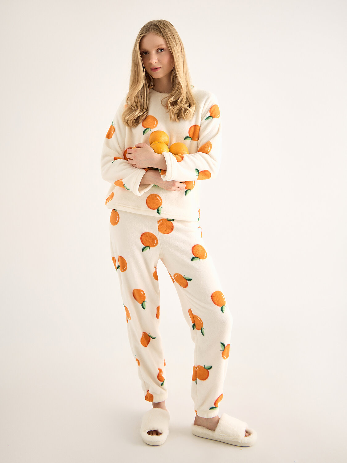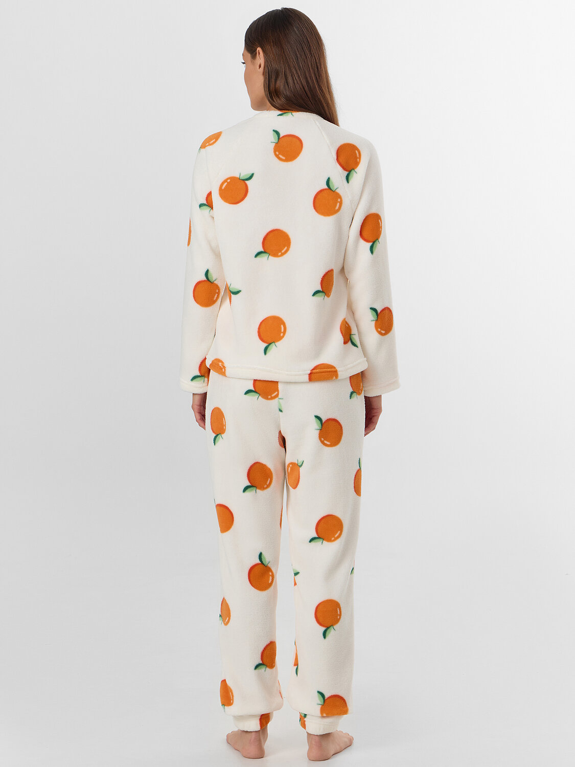Молочная домашняя пижама для женщин с солнечным принтом мандаринов подарит ощущение тепла и уюта. Нежный плюшевый материал невероятно мягкий и приятный к телу, а яркие цитрусы на джемпере и брюках создают радостное настроение.