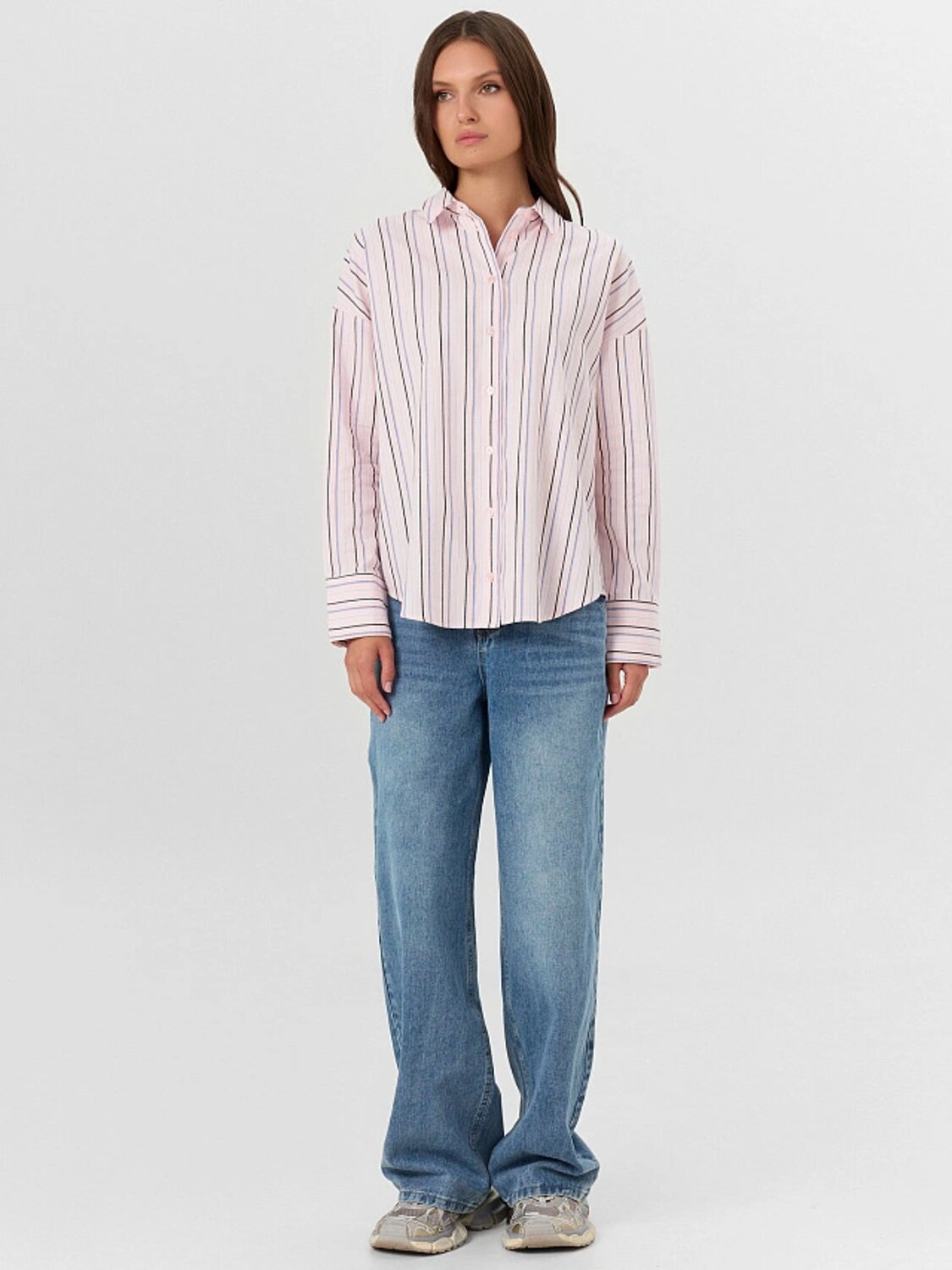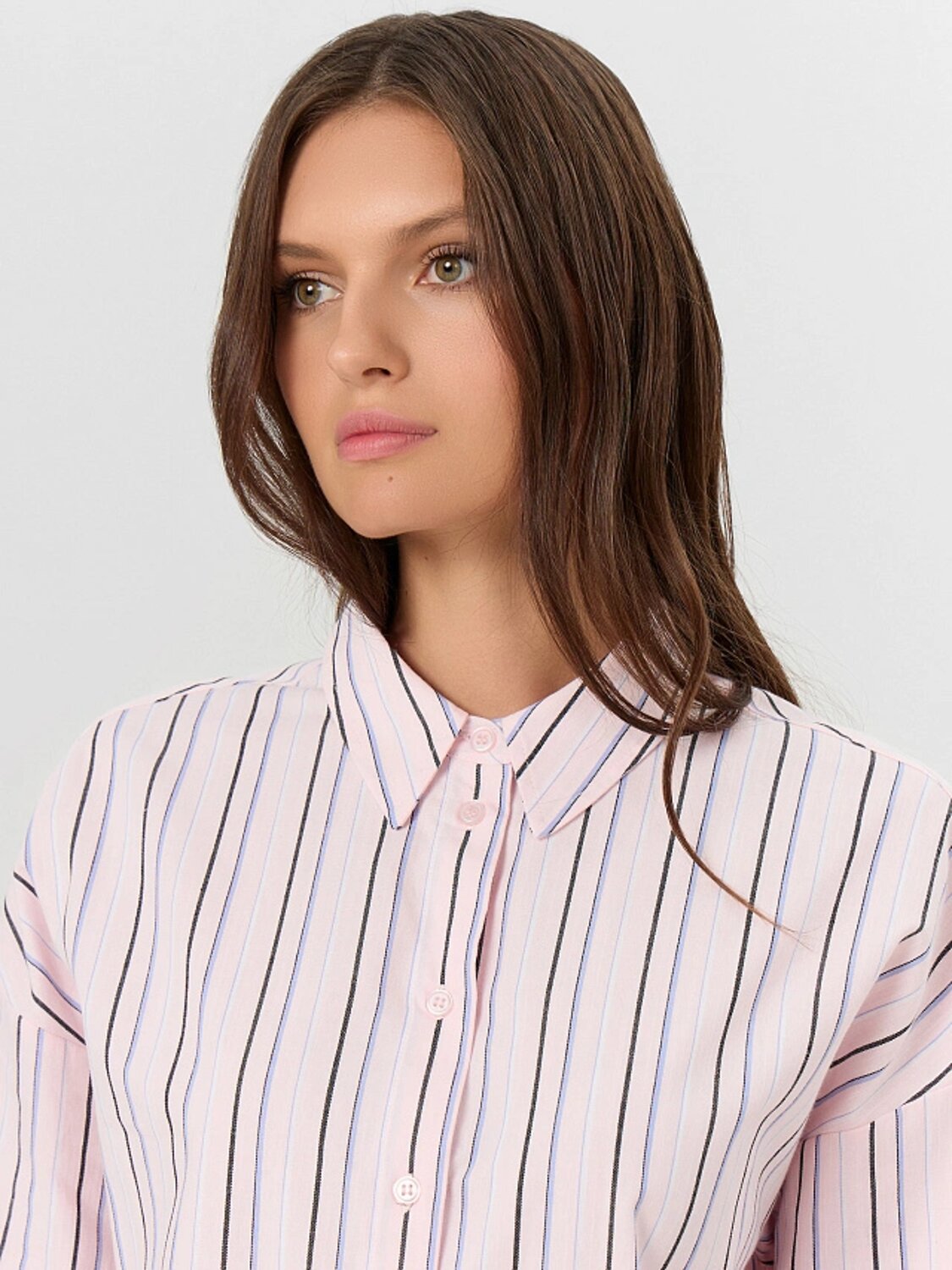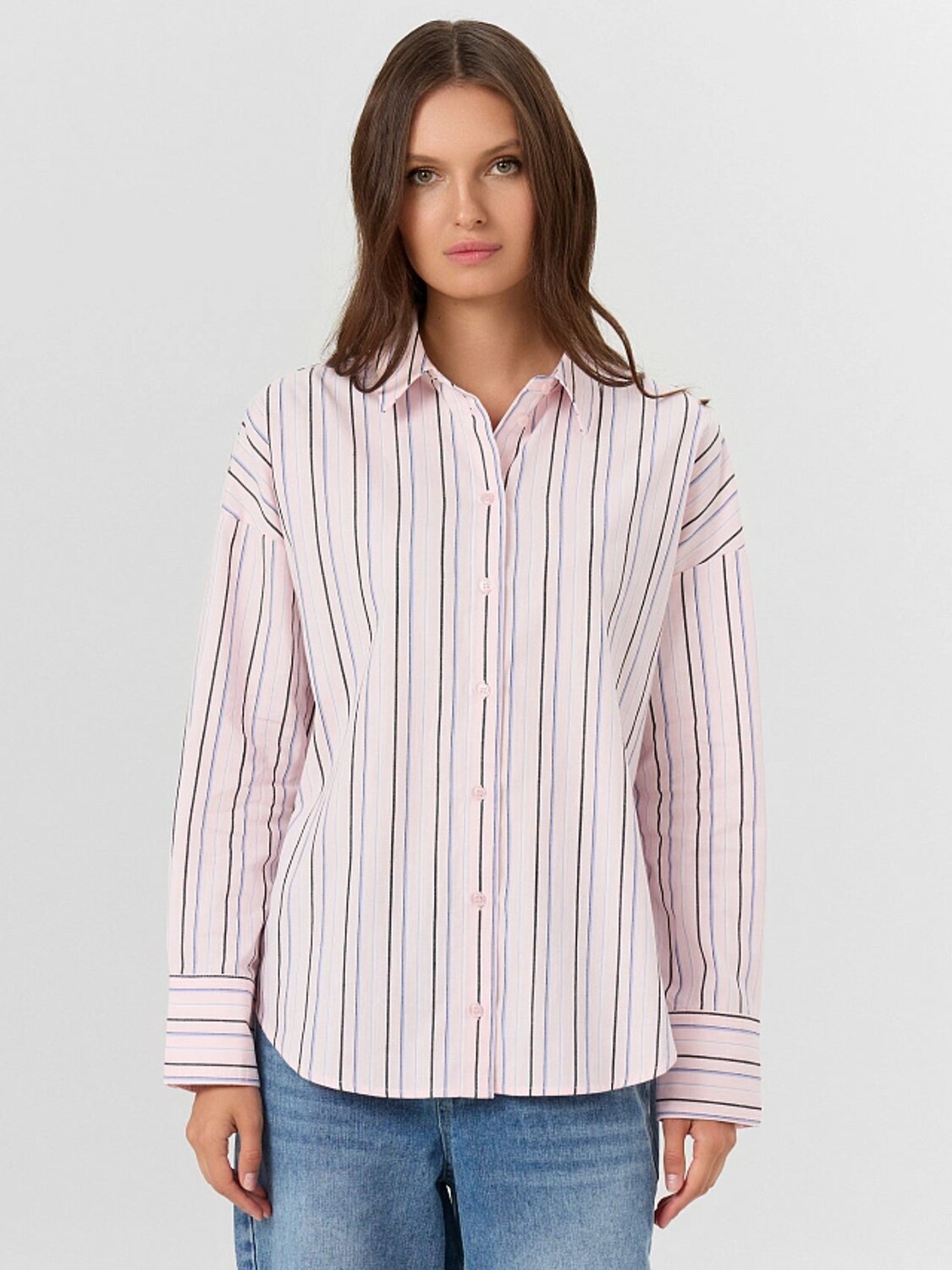 Свободный крой не сковывает движений, а тонкие вертикальные полосы визуально вытягивают силуэт, добавляя образу легкости. Женская рубашка легко сочетается с классическими брюками, джинсами или юбкой, делая её идеальным вариантом для офиса, прогулок или встреч с друзьями. Круглая горловина плавно переходит в отложной воротник, создавая гармоничный и утончённый силуэт.