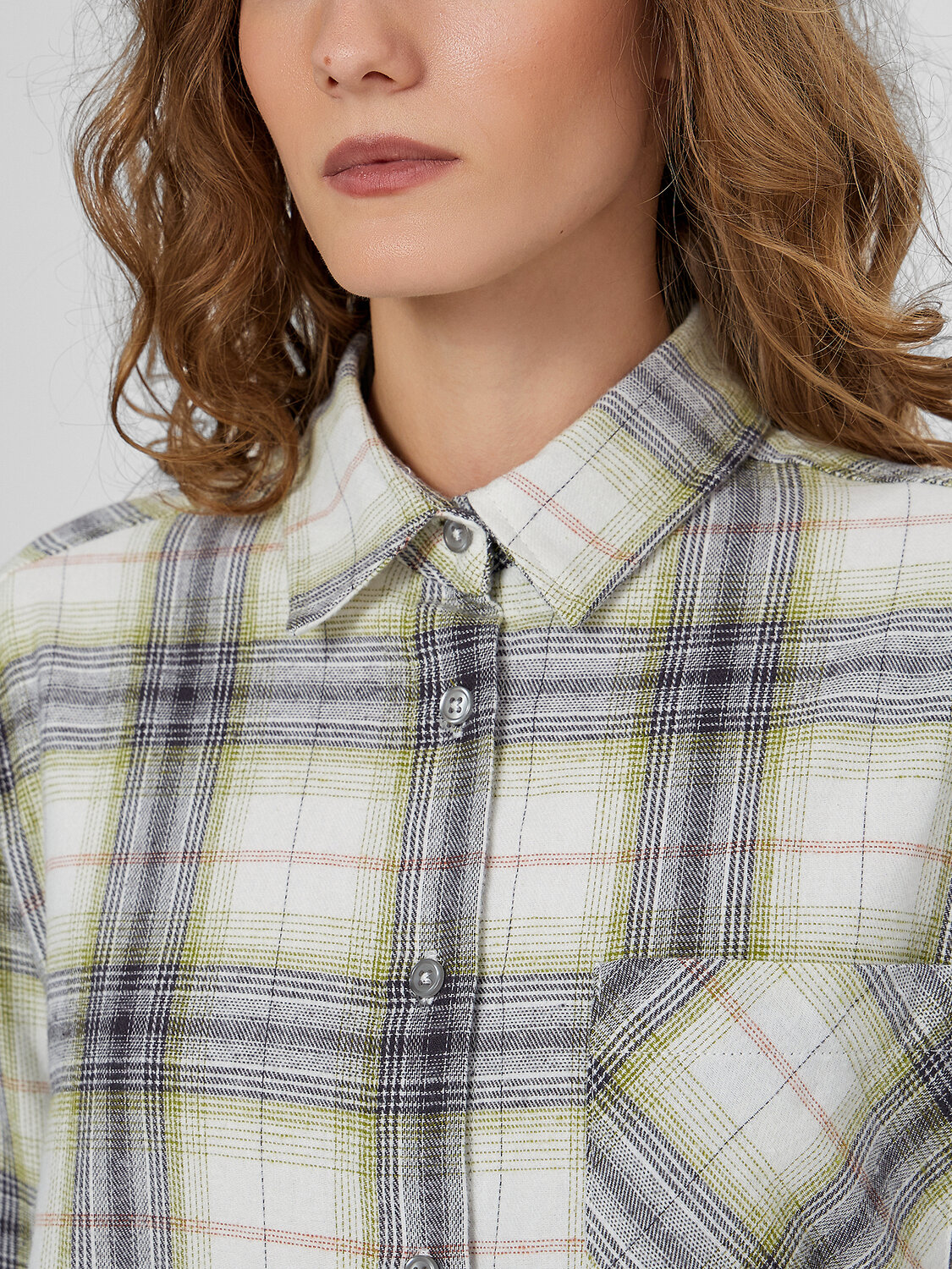 Женская рубашка из хлопка в клетку — современный базовый элемент гардероба, где классическая форма встречается с актуальным дизайном. Модель прямого силуэта с отложным воротником и длинными рукавами на манжетах создает выразительный образ. Нагрудный карман и застежка на пуговицы по всей длине и на манжетах подчеркивают продуманность деталей.