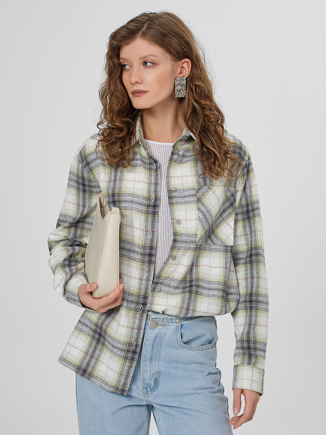 Эта модель легко сочетается с джинсами, брюками современных фасонов и юбками, позволяя создавать стильные комбинации. Графичная клетка делает рубашку самостоятельным акцентом в луке, который органично дополнит как расслабленные, так и собранные образы.