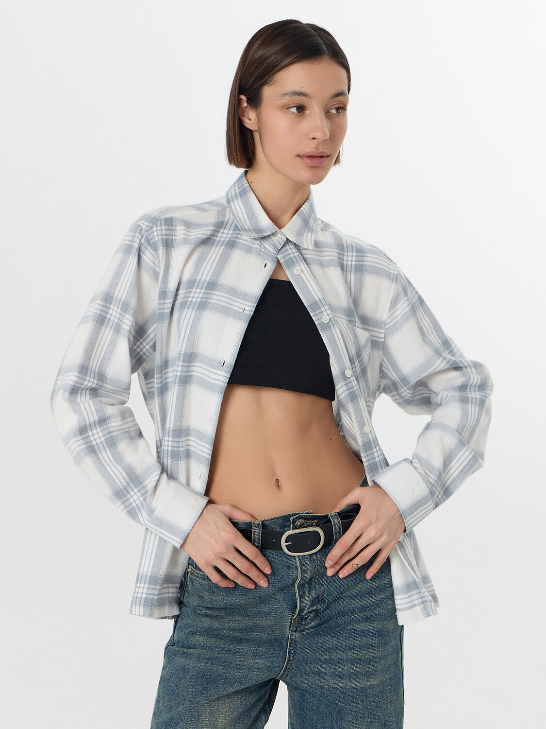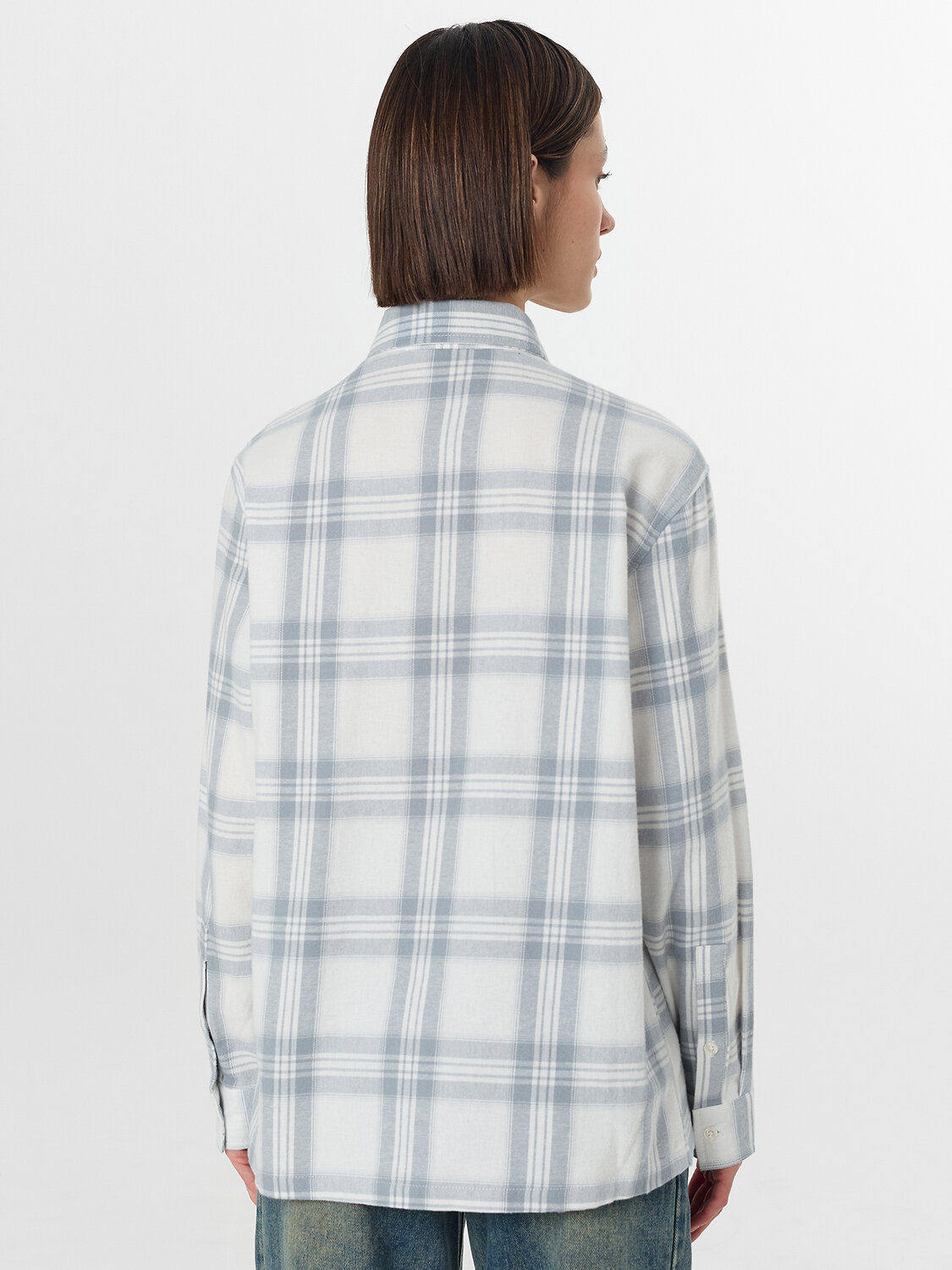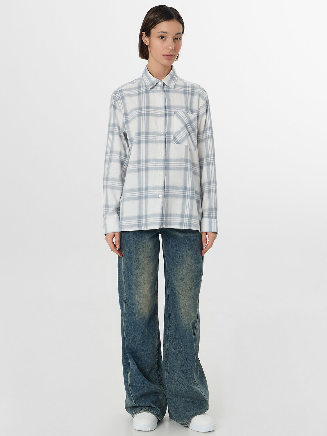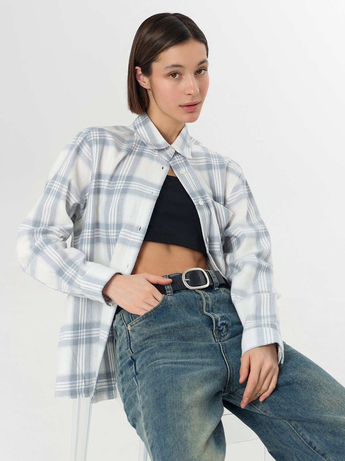 Эта модель легко сочетается с джинсами, брюками современных фасонов и юбками, позволяя создавать стильные комбинации. Графичная клетка делает рубашку самостоятельным акцентом в луке, который органично дополнит как расслабленные, так и собранные образы.