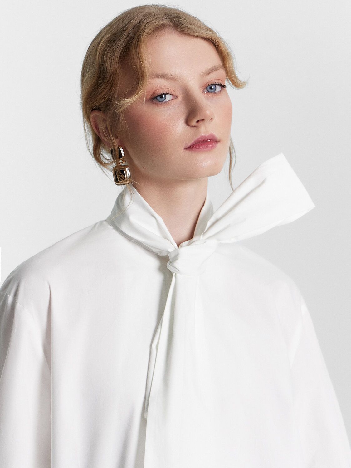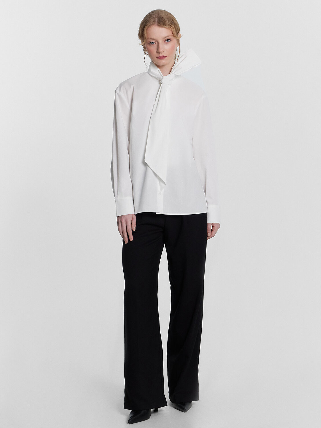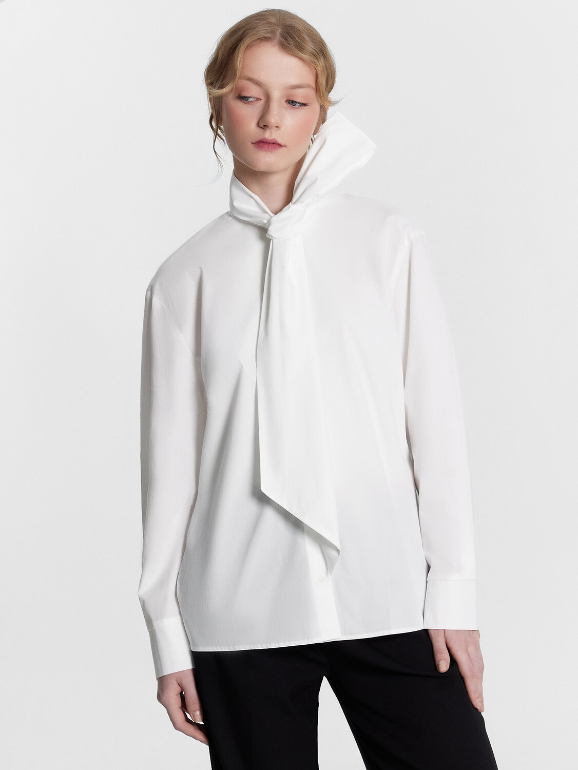 Блузка прямая, свободная. Горловина круглой формы с воротником-бантом. Рукава втачные длинные с отрезными манжетами. По низу рукава заложены складки. По переду обработана центральная застежка на петли и пуговицы (на 4 прокола D10мм). По спинке отрезная кокетка. На нижней части спинки по центру заложены складки. Нижний срез блузки обработан швом вподгибку с закрытым срезом.