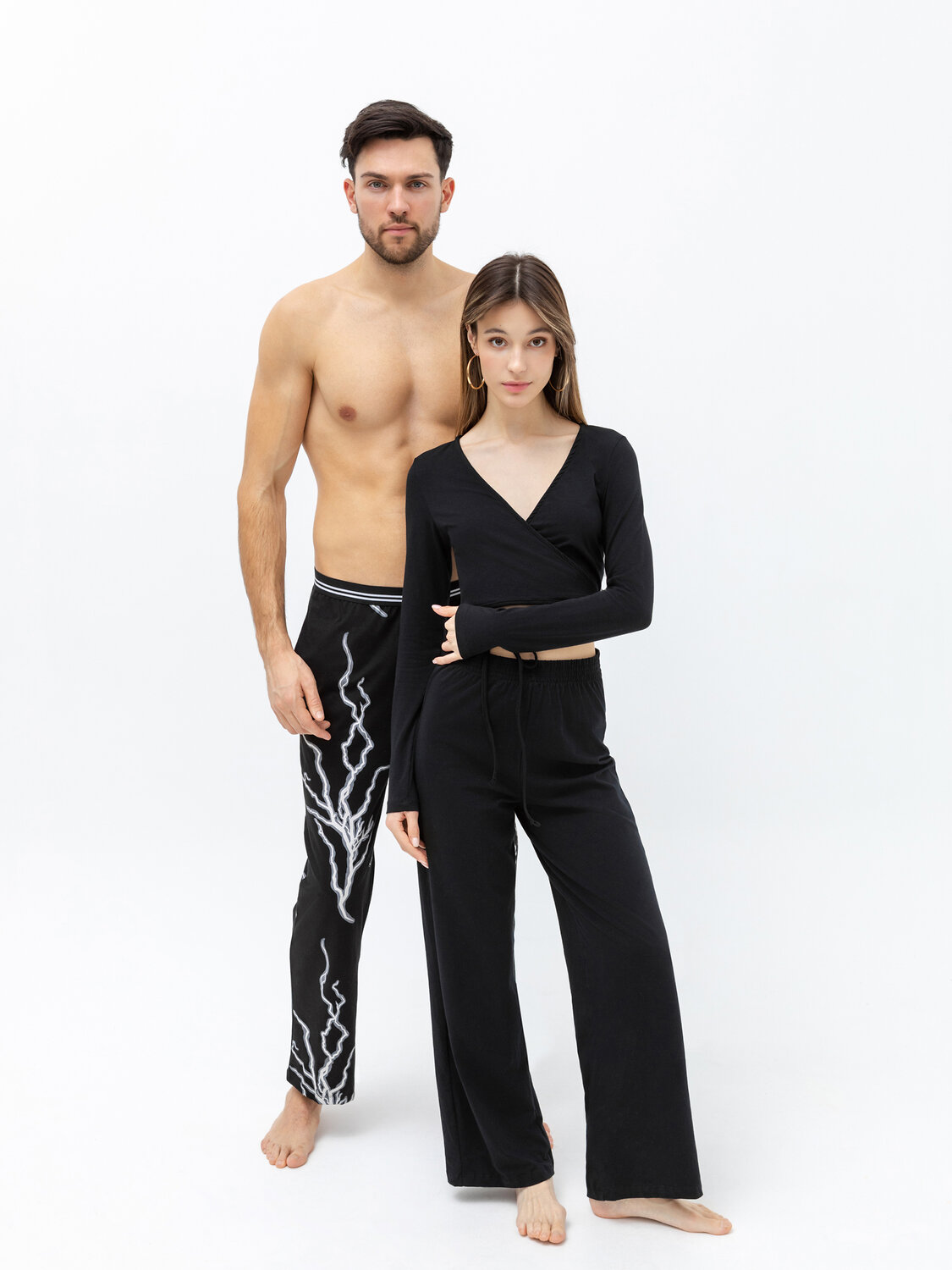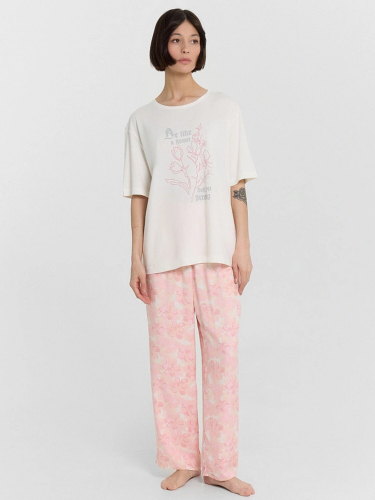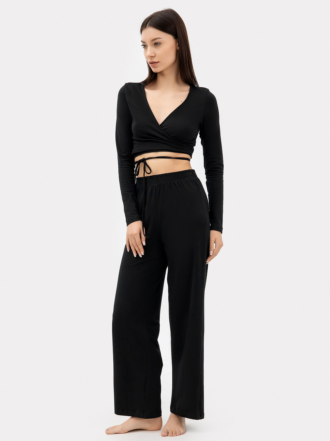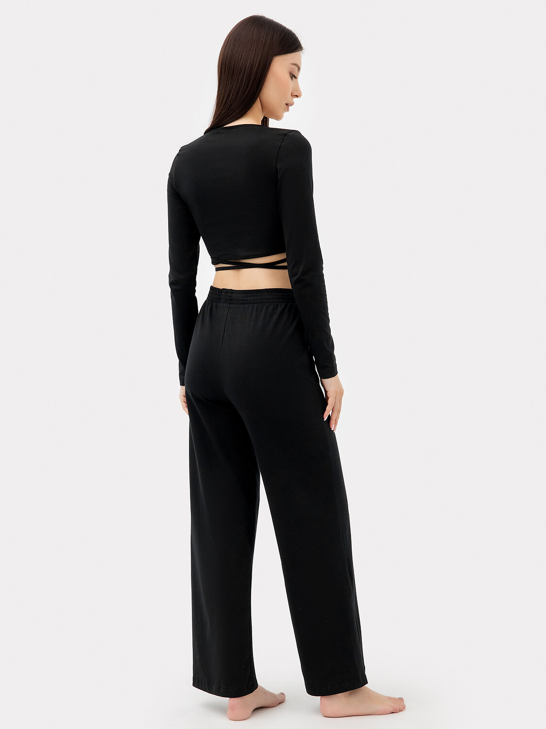 Брюки с посадкой на талии свободного силуэта. Пояс цельнокроеный с резиной внутри. Низ изделия застрочен швом в подгибку.