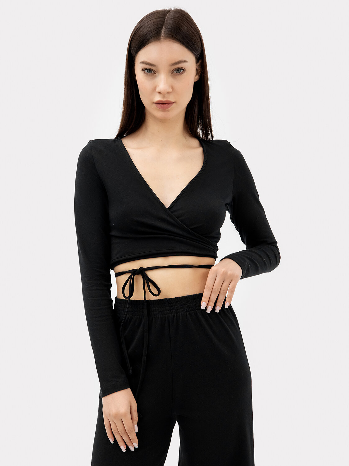 Джемпер женский прилегающего силуэта. Полочка состоит из двух частей, на запах, на завязках. Рукава длинные, втачные. Низ рукавов обработан швом в подгибку. Горловина и детали полочки обработаны в чистый край. Низ обработан бейкой.