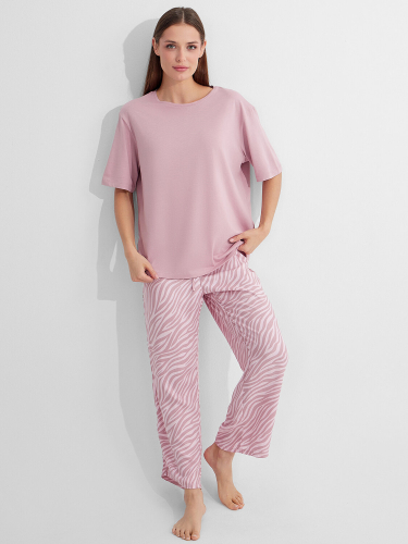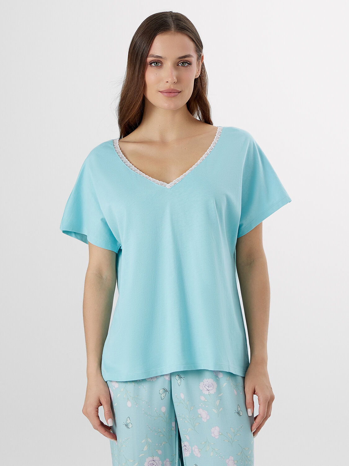 Комплект женский состоит из футболки и бридж. Футболка свободного силуэта. Горловина V-образная с отделькой из кружева, по спинке обтачка из основного полотна. Рукав короткий. Нижний срез футболки и рукавов обработан швом в подгибку.